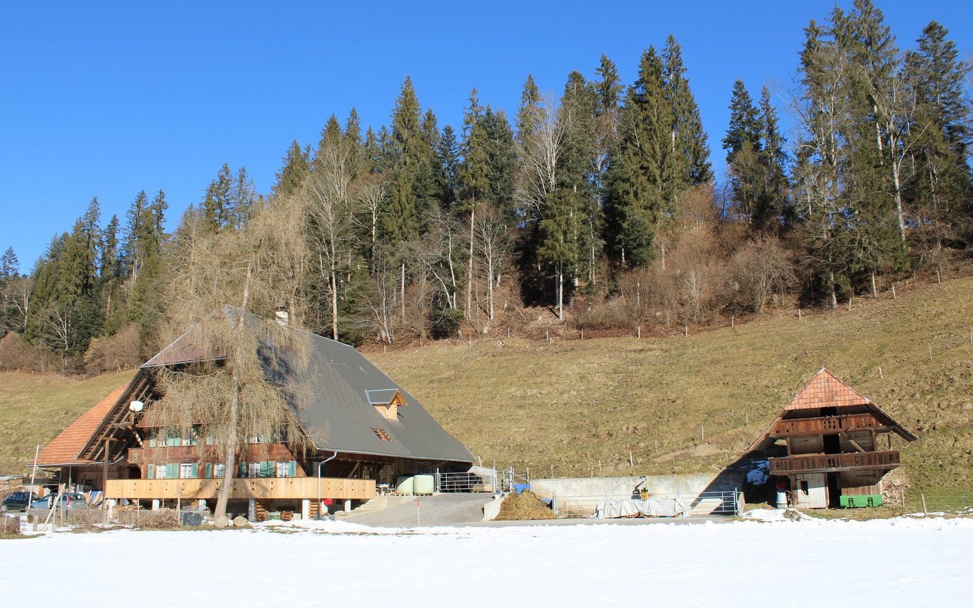 «Panakeia», ruft Gisela Schlüchter. Sofort kommt eine der Kühe zutraulich näher und lässt sich kraulen. Die Tiere stehen an diesem sonnigen Wintertag zufrieden im Laufhof und pflegen sich. Gisela Schlüchters Rinder sind handzahm, was die Arbeit im Stall sehr erleichtert. Sie bewirtschaftet seit 2014 den elterlichen Hof in Röthenbach BE. Ihr Werdegang verlief nicht geradlinig, dass sie dereinst den Hof übernehmen würde, war nicht von Anfang an geplant.