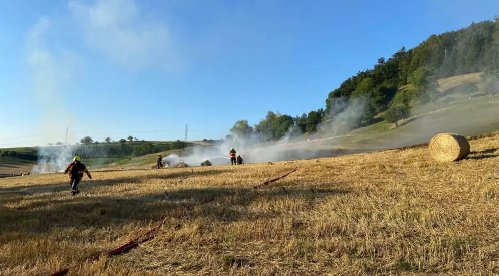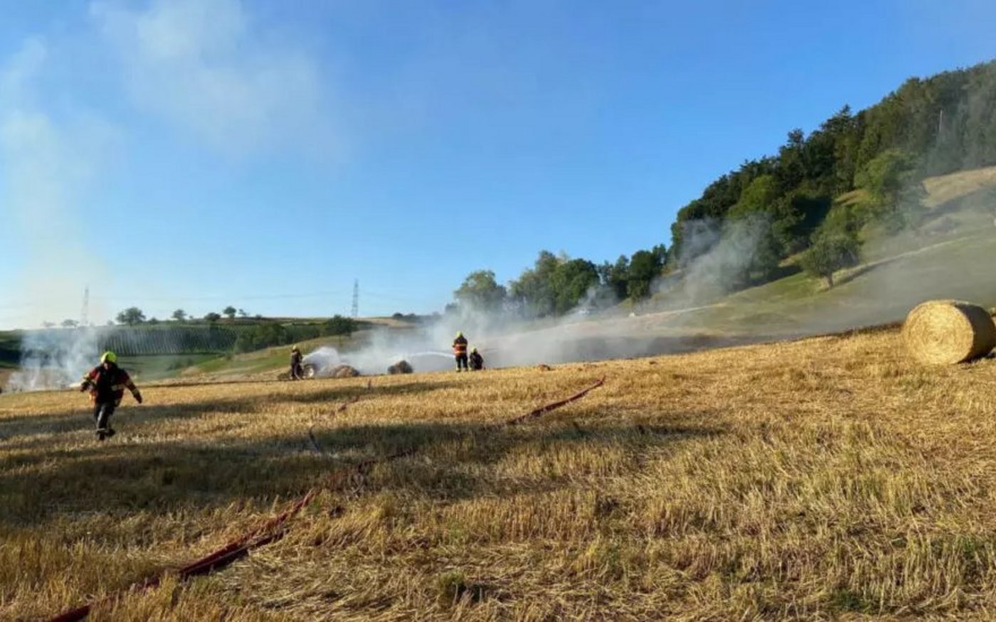Ein Landwirt war laut der Kantonspolizei Aargau auf einem Feld an der Hauptstrasse zwischen Sulz und Mönthal damit beschäftigt, Strohballen zu pressen. Dabei geriet einer der Strohballen in Brand. Das Feuer habe sofort auf das Stoppelfeld übergegriffen.