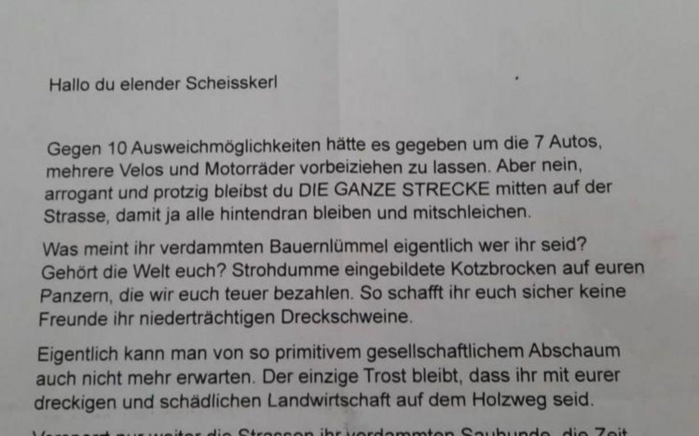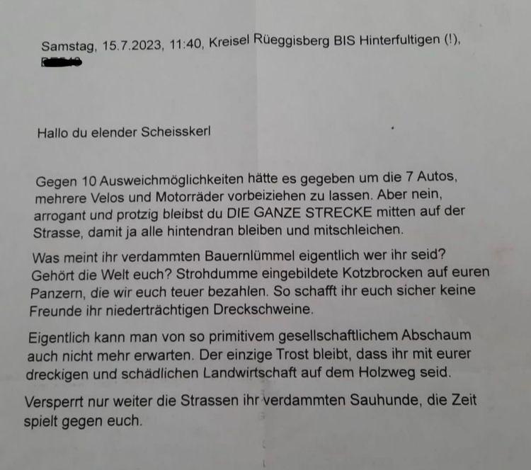 Dass es in der breiten Bevölkerung manchmal an Verständnis für die Landwirtschaft und die Sachzwänge fehlt, ist nichts Neues. Auch dass der Anstand bisweilen flöten geht, wenn Leute das Gefühl haben, sich beschweren zu müssen, ist bekannt. Doch der anonyme Brief, der jüngst bei einem Lohnunternehmen aus dem Bernbiet im Briefkasten lag, übertrifft sowohl im Tonfall als auch in der Wortwahl die meisten «Beschwerden».…