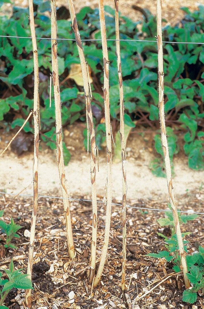 Der Schnitt von Herbsthimbeeren ist sehr einfach. Hier werden im Winter sämtliche Triebe bodeneben gekappt. Die neuen Ruten treiben im Frühjahr aus, wobei sie ein beachtliches Wachstum an den Tag legen können. Daher bietet sich eine Stütze an, zum Beispiel ein 80 cm breites Maschengitter, das man auf mehreren etwa einen Meter hohen Pfählen fixiert.