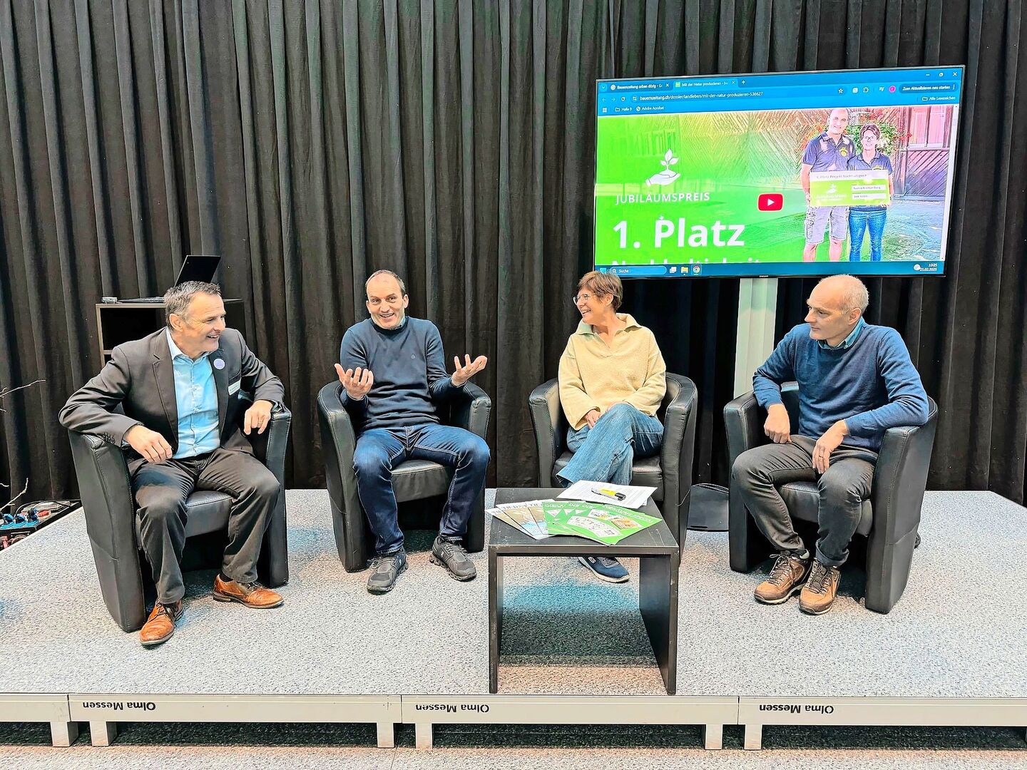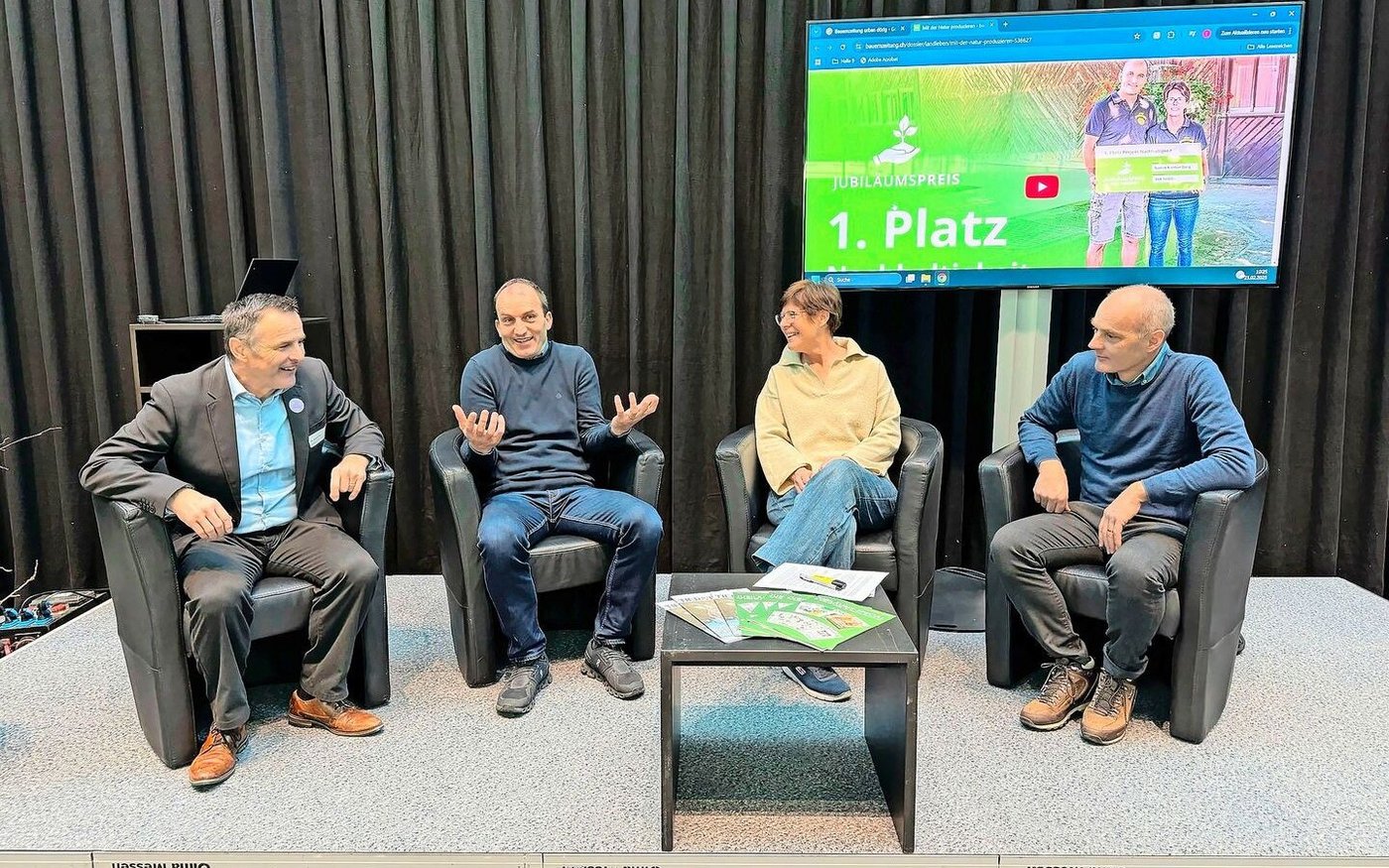 An der ersten Talk-Reihe «Zukunftsbauern» zum Thema Nachhaltigkeit nahmen für einmal allein Thurgauer Gäste Platz. Urs Schneider aus Amlikon-Bissegg war stellvertretender Direktor des Schweizer Bauernverbandes und ist Präsident der Stiftung für eine nachhaltige Ernährung durch die Schweizer Landwirtschaft. Er amtete als Jury-Präsident des Jubiläumspreises der Schweizer Agrarmedien AG. Den Jubiläumspreis in der Kategorie Nachhaltigkeit konnte er Nadine und Urban Dörig aus Diessenhofen TG überreichen.