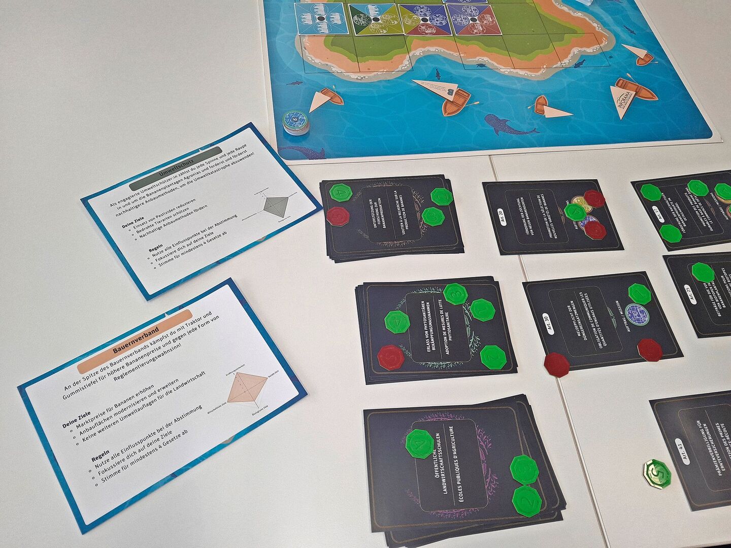 Denn wie in der realen Agrarpolitik stimmen die Spieler(innen) über Gesetzesänderungen ab, je nach ihrer Rolle. Ziel ist eigentlich, die Fläche von Agronia sinnvoll zu nutzen und den Aufträgen der Bevölkerung gerecht zu werden. Doch durchkreuzen unterschiedliche Ziele diese Absichten – ebenfalls wie in der Realität.