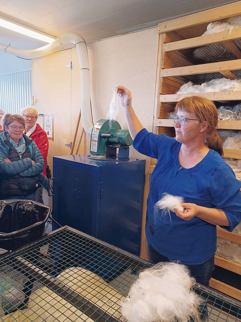 Auf einem weiteren Besuch lernte die Reisegruppe Hulda Brynjólfsdóttir kennen. Die Agronomin führt mit ihrem Mann Tyrfingur Sveinsson einen Schafbetrieb in Hellu. Die Wolle der Tiere verarbeitet und vermarktet sie komplett selbst. Doch nicht nur Schafwolle wird verarbeitet: Auch die Haare von Hunden und Kaninchen werden zu Wolle, dazu experimentiert sie mit Milch, Rosen und Algen.