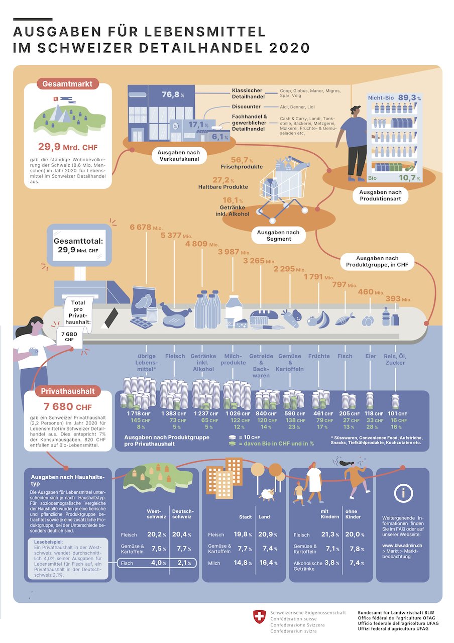 Basierend auf den Zahlen des Bundesamts für Statistik und der Marktforschung hat das Bundesamt für Landwirtschaft den Detailhandel als den wichtigsten Absatzkanal der Schweizer Landwirtschaft analysiert. Entstanden ist ein Überblick über die Lebensmittelausgaben in den Geschäften (ohne Online-Handel) verschafft: