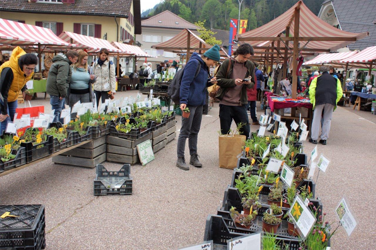 Kurz nach dem Start waren die beiden Hauptplätze bereits gefüllt mit Menschen, die eifrig Pflanzen in dem riesigen Angebot an Kräutern, Wildpflanzen, Sträuchern, Geranien oder Gemüsesetzlingen suchten. Und wenn diese in den Körben und Taschen verstaut waren, wurde weitergestöbert.