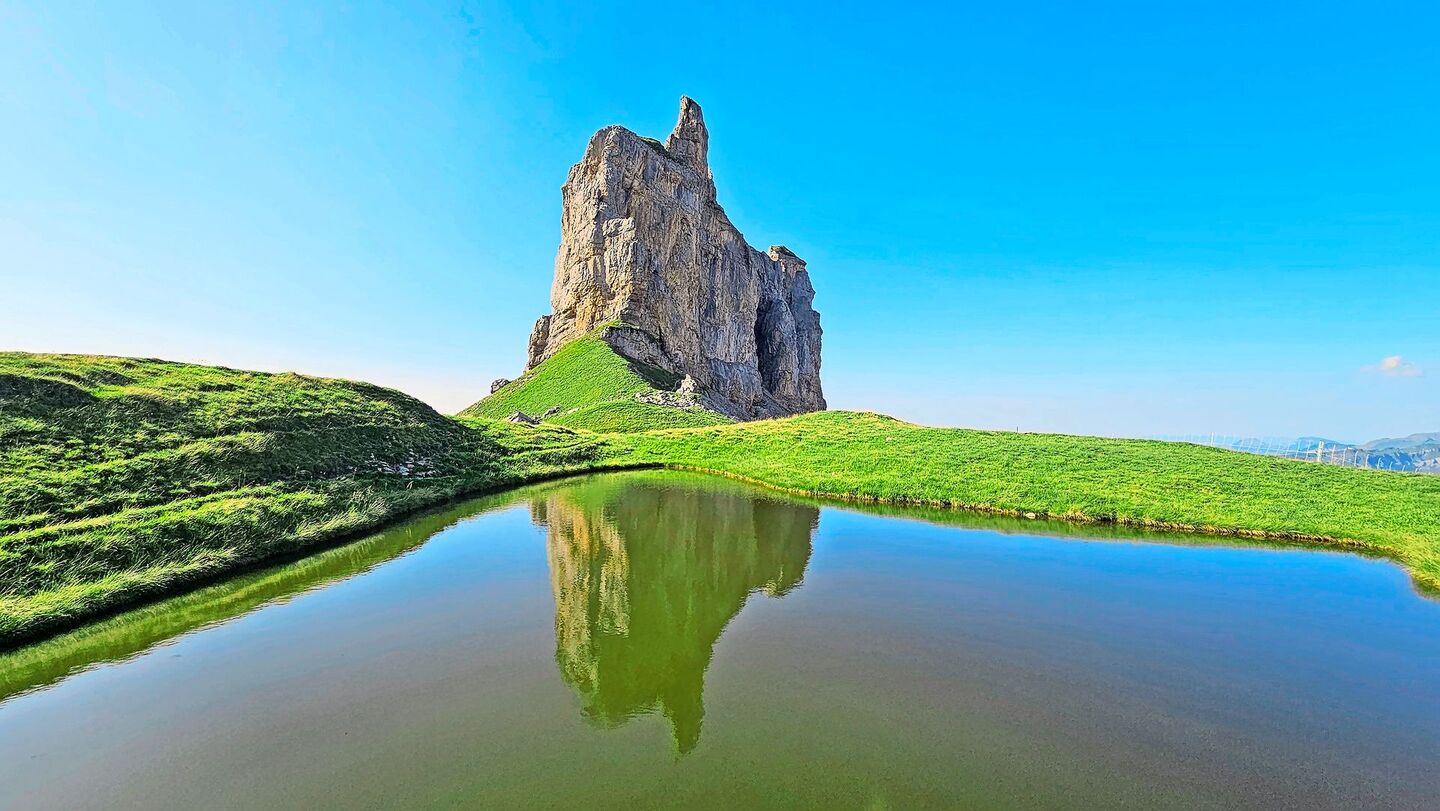 Rund drei Stunden dauert der steile Aufstieg von der letzten Parkmöglichkeit bis zum Hochplateau, wo die Schafe der Älplerfamilie Gwerder sömmern. Das Weidegebiet liegt sehr idyllisch, der kleine Bergsee und der markante Felsgipfel geben ein herrliches Bild ab. Das abgeschiedene Plätzchen, das bis vor fünf Jahren noch ein Geheimtipp von Einheimischen war, hat sich mittlerweile schon fast zu einem Instagram-Hotspot…