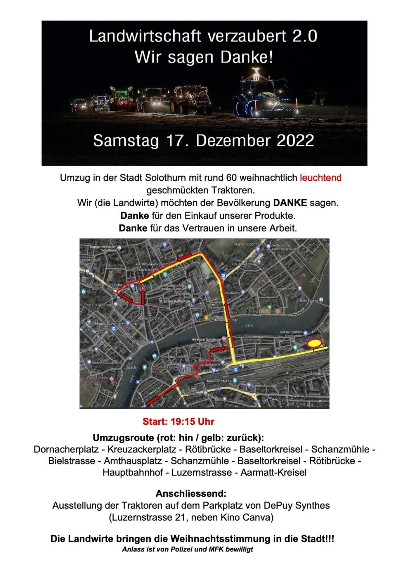 Bäuerinnen und Bauern aus der Region Solothurn möchten auch dieses Jahr der Bevölkerung mit einem Umzug mit weihnachtlich geschmückten Traktoren «Danke» sagen, wie das Organisationskomitee (OK) in einer Medienmitteilung schreibt.