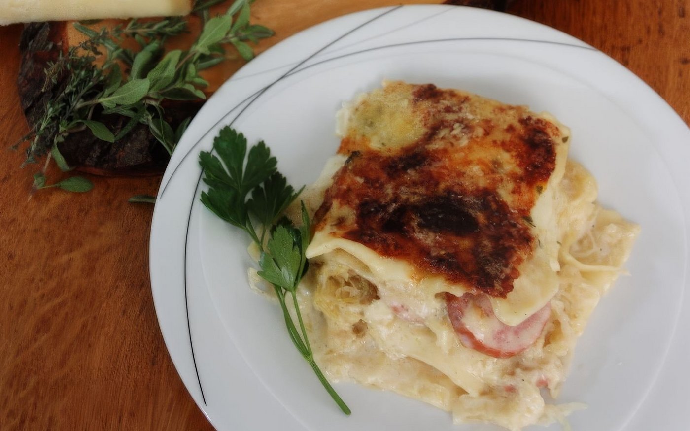 Der Kanton Bern gilt als grösster Agrarkanton. Durch ihn führt der vielbesagte «Röstigraben», der die Deutschschweiz von der Romandie trennt. Bekannt sind etwa auch die Berner Rösti oder die Berner Platte. Letztere stand auch Pate für diese Lasagne. Die Berner Platte besteht aus vielen Fleisch- und Wurstsorten sowie Gemüsen wie Sauerkraut oder Bohnen. Alles in eine Lasagne zu verpacken, hätte den Rahmen gesprengt. Daher beinhaltet die Berner Lasagne lediglich Sauerkraut und Zungenwurst. Fehlen darf natürlich der Emmentaler Käse nicht.