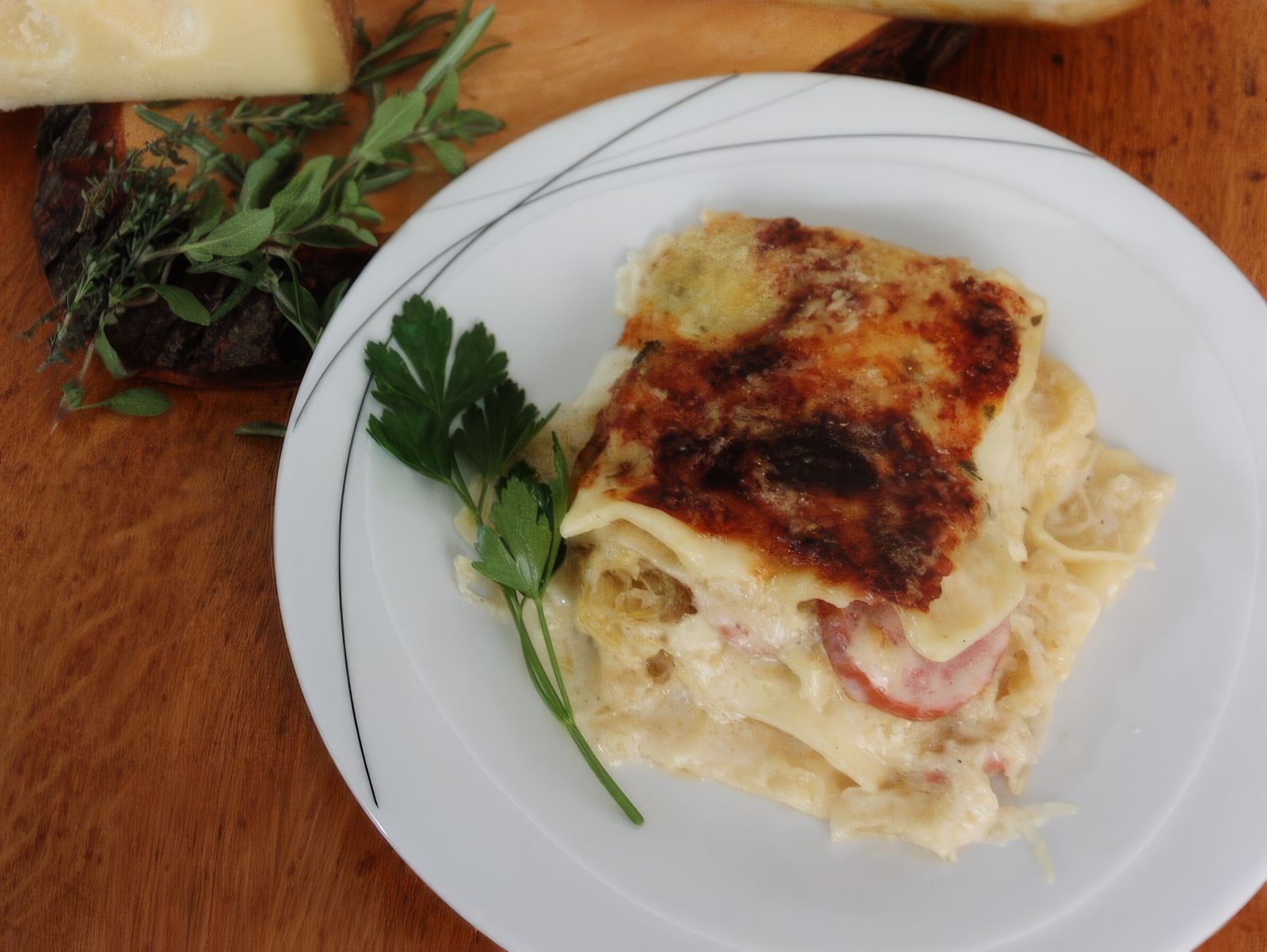 - Etwas Béchamel in die gefettete Platte verteilen und Lasagneplatten darauflegen. Je 1/3 Sauerkraut und Zungenwurst darauf verteilen, wenig Béchamel darüber verteilen, mit Lasagneplatten zudecken. Vorgang zweimal wiederholen. Abschliessen mit Béchamelsauce-bedeckten Lasagneplatten. Mit Kräutern und Käse bestreuen. In der unteren Hälfte des auf 180 Grad vorgeheizten Ofens ca. 40 Minuten backen.