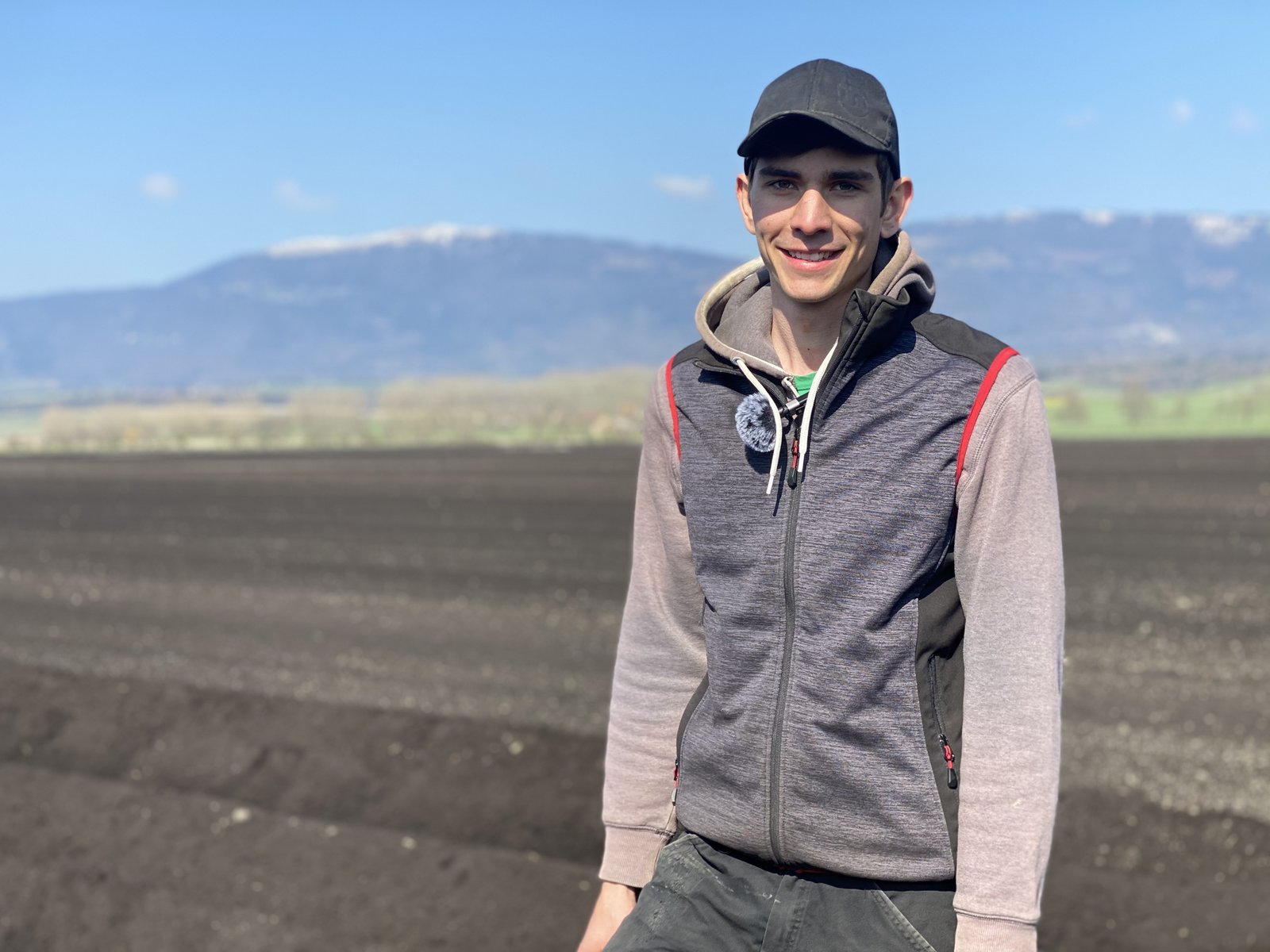 «Ich absolviere mein drittes Lehrjahr auf einem intensiven Ackerbaubetrieb, der 145 Hektaren umfasst – hier läuft es immer Vollgas», meint er und findet offenbar Gefallen daran. Dementsprechend finden wir seinen Lieblingsort nicht etwa neben einer schönen Kuh oder auf einem Hügel mit Sonnenuntergang, sondern auf dem 2 Meter hohen New Holland. «In meiner Freizeit ging ich meinem Bruder schon früher auf einem Lohnunternehmen aushelfen». Er zeigt in die Ferne des Kartoffelackers. «Diese Aussicht erklärt doch alles», sagt der begeisterte Junglandwirt. «Aber manchmal ist es schon weit – von Dändlikon nach Mathod», fügt er hinzu und lässt den Blick über den schwarzerdigen Acker schweifen.