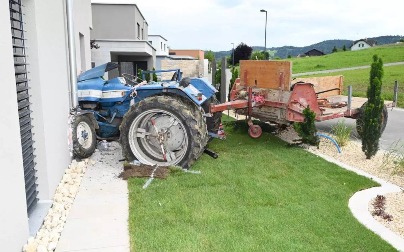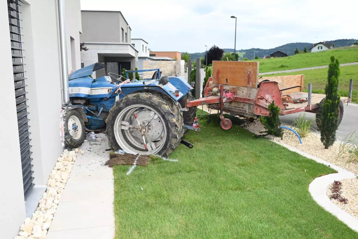 Der Traktor fuhr führerlos weiter und krachte schliesslich gegen die Fassade eines Einfamilienhauses, die dabei stark beschädigt wurde. Der Sachschaden wird auf mehrere tausend Franken geschätzt.
