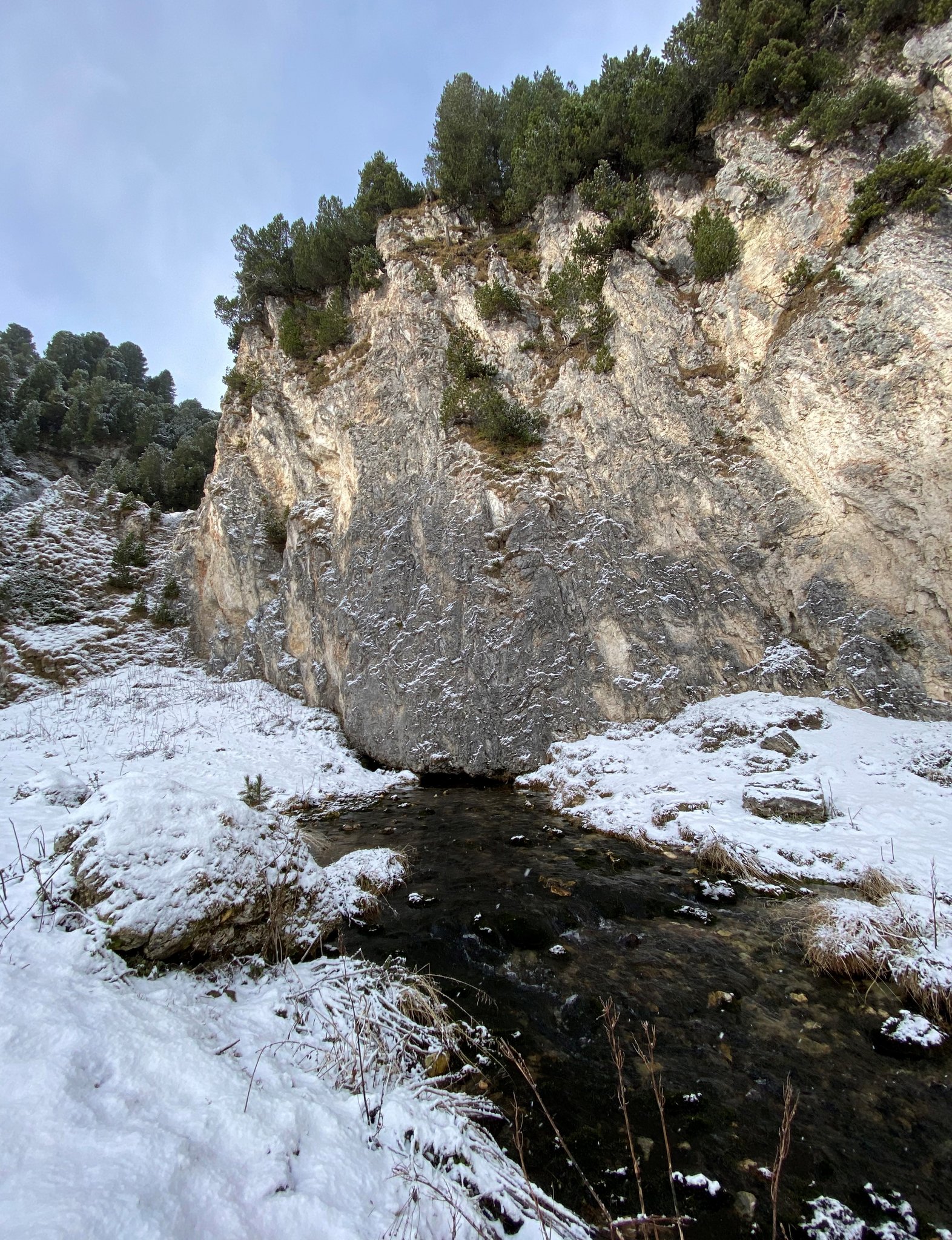 Nachdem Vater und Sohn mir die Eckdaten zum Betrieb erläutert haben, geht es auf 2000 m ü. M. zum Standort der Alp. Ein kräftiger Wind weht, Schnee ist gefallen. Die Temperaturen liegen unter dem Gefrierpunkt. Auf der Lucomagno-Passstrasse fahren wir vorbei an Sumpfflächen und Wäldern voller Arven, deren Spitzen schneebedeckt sind. Wir befinden uns im Bleniotal, wo die Quellen des Brenno sind.[IMG 3]