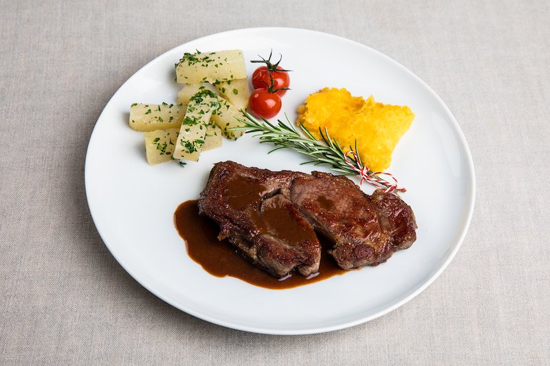 - Je ein Rindshohrückensteak auf vorgewärmten Teller anrichten.