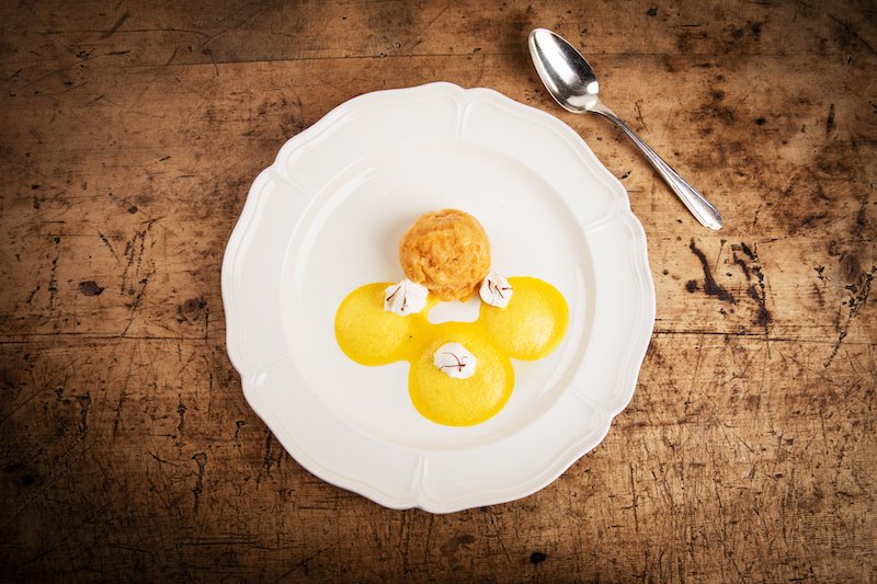 Eine Kugel Aprikosen Sorbet auf Dessertteller anrichten. 3 Kugeln Frischkäse dazu anrichten. Mit Safranschaum und Safranfäden ausgarnieren
