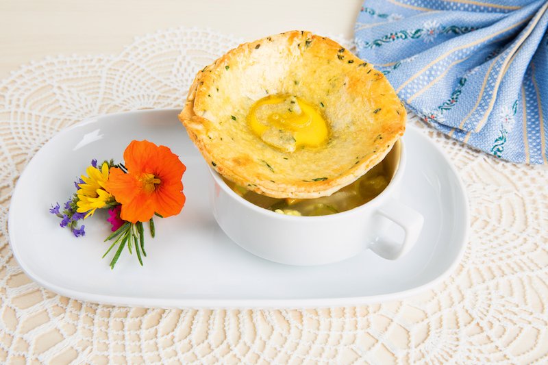 - Die abgeschmeckte Gemüsesuppe auf 4 Suppentassen verteilen. Die Eierstich-Edelweiss dazu legen. Den Tassenrand mit Wasser benetzen und sofort mit dem Teigdeckel bedecken, gut anpressen und mit Eigelb bestreichen.
