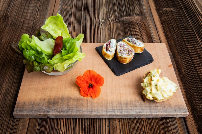 Blattsalat auf Vorspeiseteller anrichten. Evt. mit Mostbröcklirolle, Eierscheibe und Blüten ausgarnieren. Die Eier Brötli dazu legen und eine Omelettenschnitte dazu anrichten.