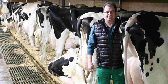 Mit ihrem Mann spricht Sabrina Schlegel französisch, mit dem Mitarbeiter Italienisch, mit den Kühen Schweizerdeutsch. Sie geht durch den Stall und klärt gleich noch einige Fragen, während des Fotoshootings harkt sie nebenbei ein paar Liegeflächen. Herumstehen hat sie nicht auf dem Programm. Aber dann führt sie zwei Treppen hoch in das Stallbüro – der Ausblick auf130 Milchkühe ist fantastisch – und zeigt: Genau…