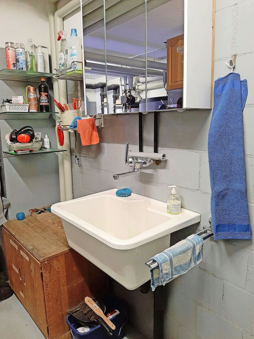Wenn der Nassraum auch als Waschküche dient, braucht es Platz für die Schmutzwäsche, für Waschmittel und natürlich für die Waschmaschine. Die Wäsche sollte in der Nähe getrocknet werden können, aber nicht zwingend im gleichen Raum, wo die schmutzige Stallwäsche hängt. Frisch gewaschene Stallkleider kann man im Nassraum trocknen, Privatkleider in der Waschküche. So bleiben die Gerüche getrennt. Hat man zwei Räume, kann man auch klar festlegen, in welchem Lavabo was gereinigt wird.