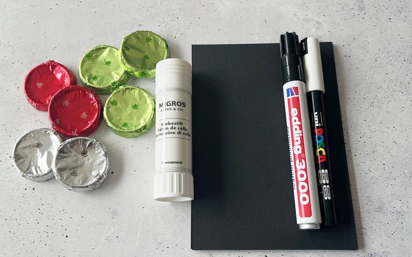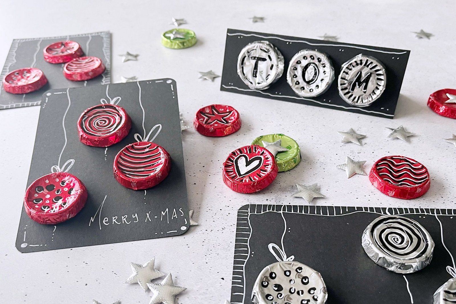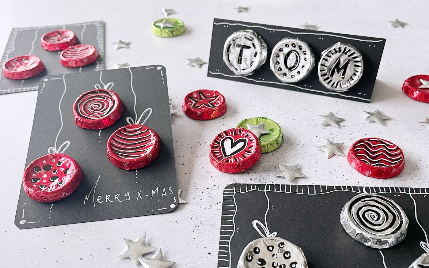 Fürs Weihnachtsfest einen Gutschein originell verpacken. Zum Jahresende eine Karte verschicken, die den Empfängern ein Lächeln aufs Gesicht zaubert. Oder eine witzige Tischkarte fürs Silvesteressen fertigen: Die hier vorgestellten Karten mit in farbigen Folien verpackten Schoggi-Rondellen sind vielseitig einsetzbar. Die dafür verwendeten runden Schokoladen heissen genau genommen «Choco-Croquettes». Der Name stammt…