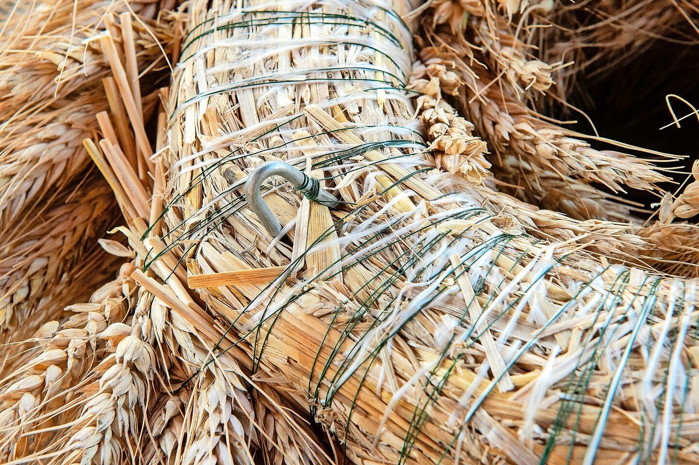 Um den Kranz zu binden, braucht es genügend Zeit und etwas Geduld. Zudem empfiehlt es sich, diesen an einem Ort zu binden, wo die Reinigung einfach ist. Denn bei der Arbeit brechen Grannen ab und diese haften überall. Eine Möglichkeit ist zum Beispiel, den Kranz auf der Terrasse draussen zu fertigen, wo der Boden mit Besen gewischt und anschliessend mit dem Gartenschlauch abgespritzt werden kann.