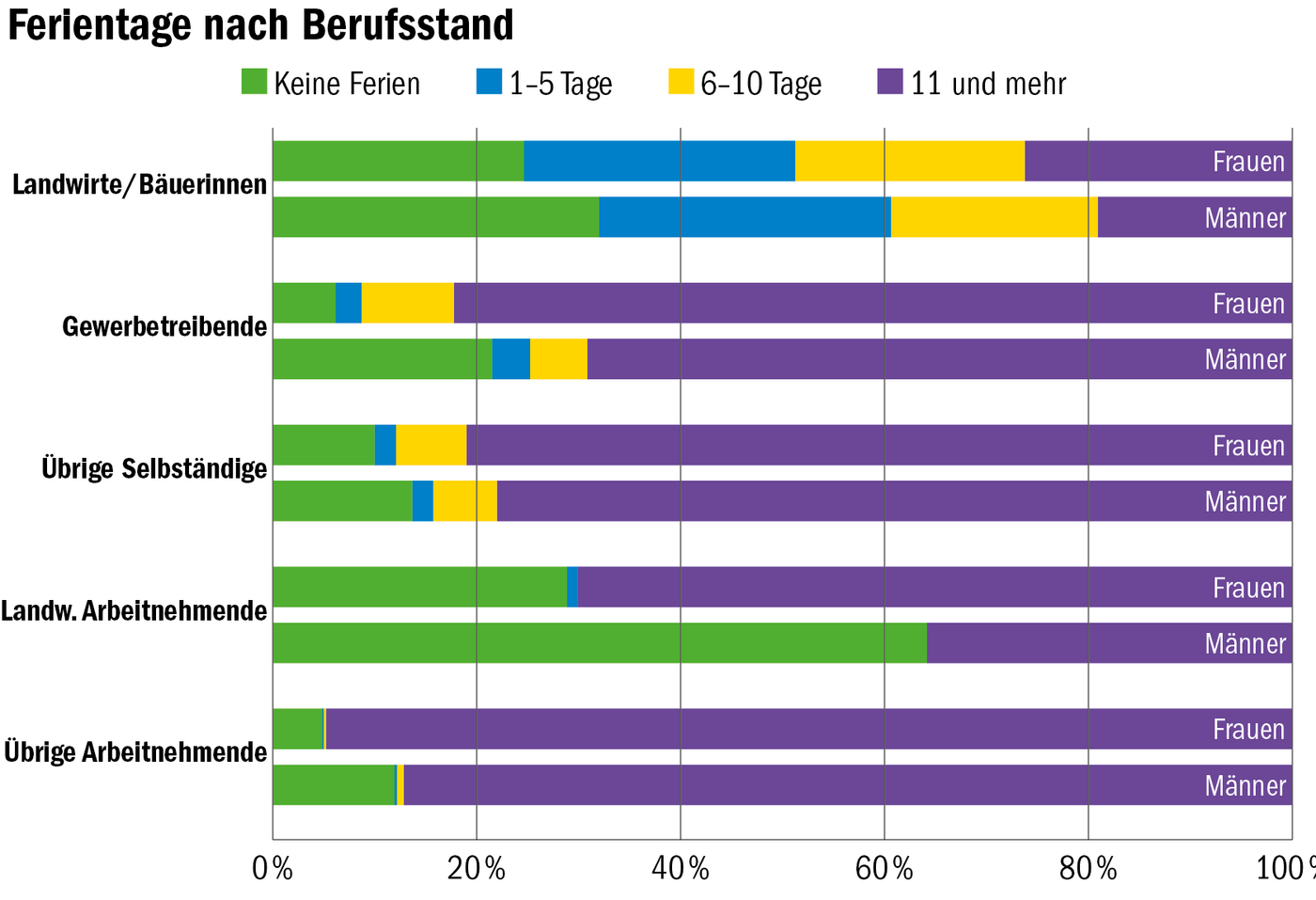 Durchschnittlich bezogen die Landwirte knapp neun Tage und die Bäuerinnen sieben Tage Ferien pro Jahr. Verglichen mit den anderen Gruppen ist das sehr wenig, wie es im aktuellen Agrarbericht heisst. Gewerbetreibende Männer machten im Schnitt 21 Tage Ferien pro Jahr, Gewerbetreibende Frauen 17 Tage. Für Bauernfamilien, insbesondere für jene mit Nutzvieh, ist es aufwendig, vom Betrieb vorübergehend wegzugehen. 24 % der…