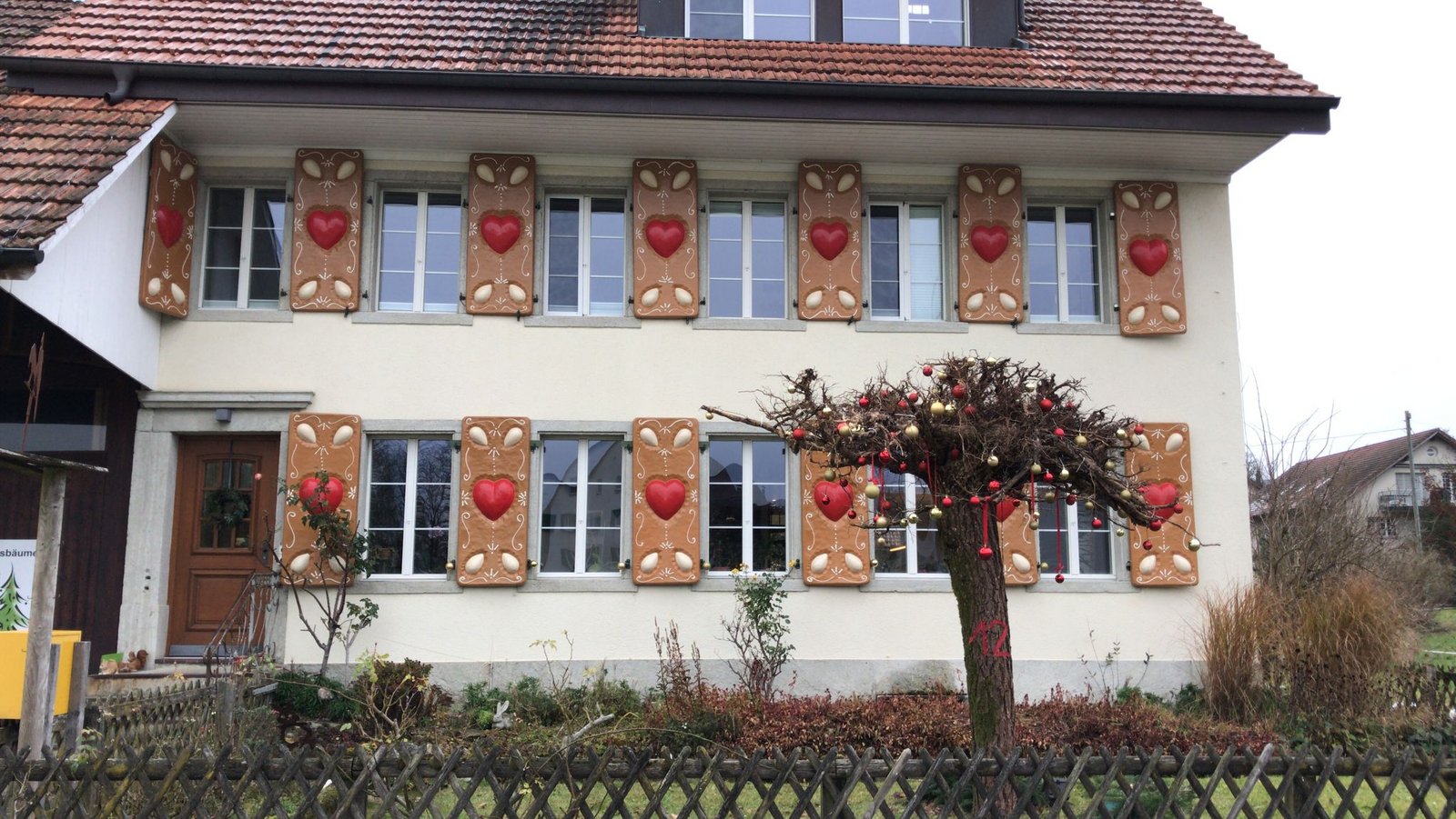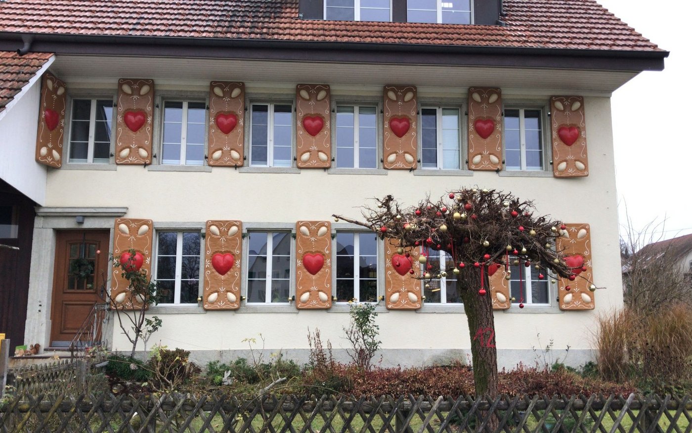 Das ist ein Kunstwerk von einem Künstler aus der Umgebung, den wir kennen. Den wetterfesten Löwenzahn haben wir von ihm ausgeliehen und als Dekoration in unseren Garten gestellt. Unser Haus sieht aktuell aus wie ein riesiges Lebkuchenhaus, denn der gleiche Künstler hat uns Lebkuchen-Fensterläden gemacht. Er heisst Bonvalet.
