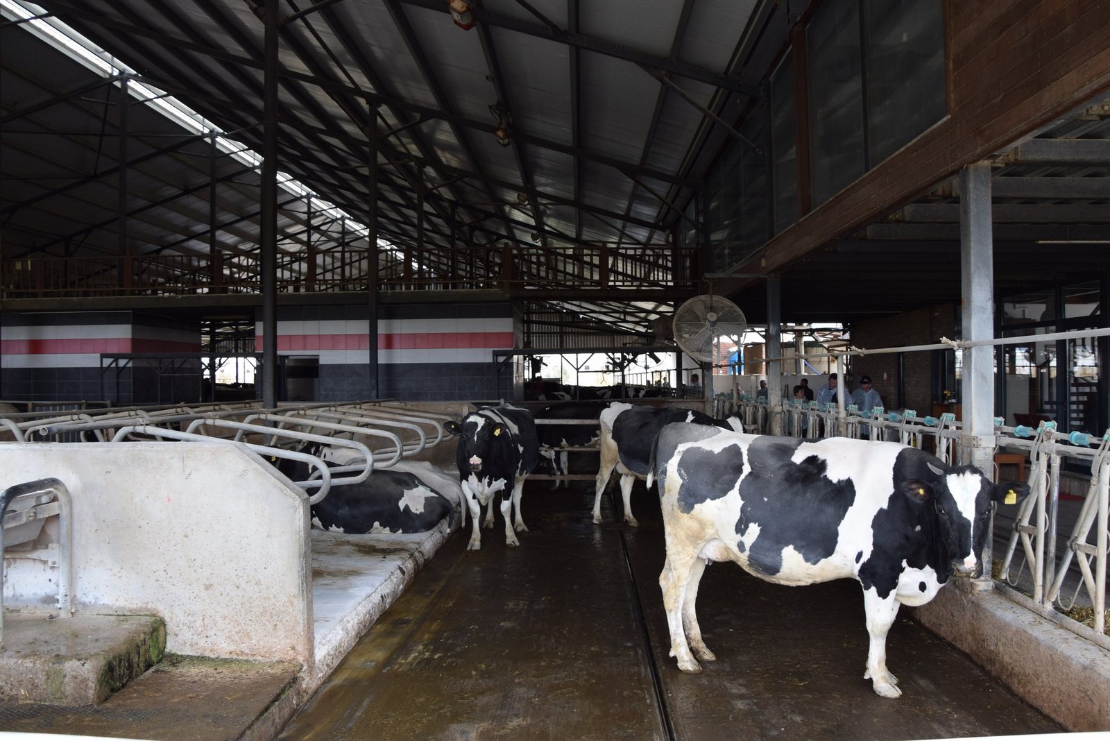Die Milchkühe bekommen frisches Futter – von Vertragsbauern, die Gülle als Tausch erhalten –, das vollautomatisch gemischt und dem gemessenen individuellen Bedarf entsprechend, ebenfalls mit Robotik, verteilt wird. Die Kühe gehen freiwillig zum Melken (drei Melkroboter), was rund um die Uhr möglich ist und je nach Tier bis zu 4- bis 5-mal pro Tag stattfindet – 60 l/Kuh und Tag.