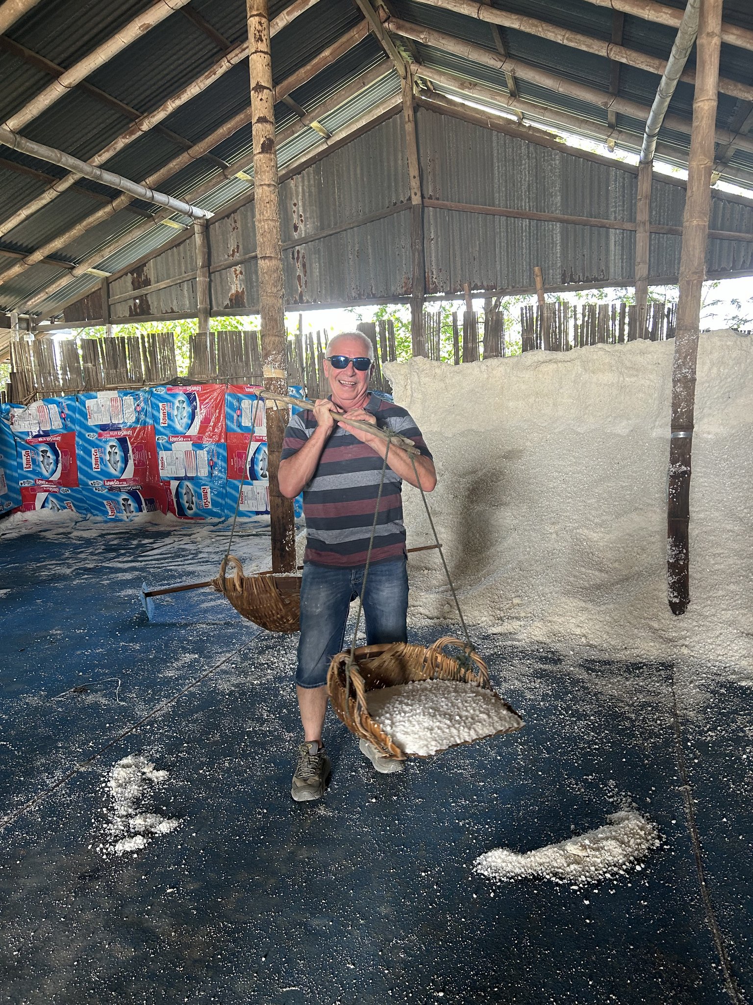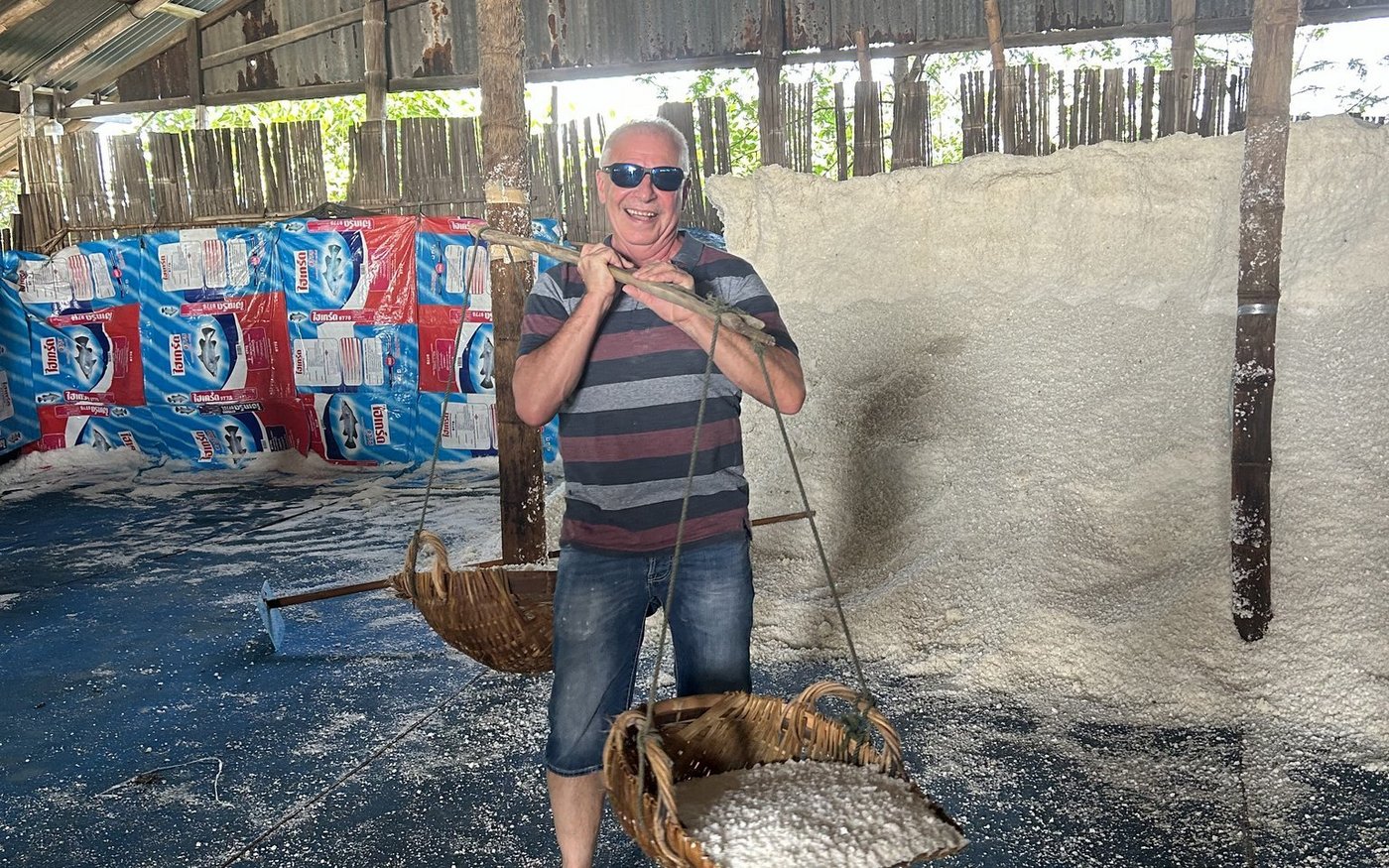 Mit einem Holzstock, an dem an beiden Enden eine Schaufel angehängt ist, trägt man die gewonnene Salzmenge von den Feldern ins Lager, was bis zu 100 Kilo auf den Schultern bedeuten kann. Beeindruckt von der Handarbeit, die täglich verrichtet wird und sicher nicht spurlos am Körper vorbeigeht, lassen wir uns weiterführen auf einen Reisanbaubetrieb etwas ausserhalb der Stadt Ayutthaya.