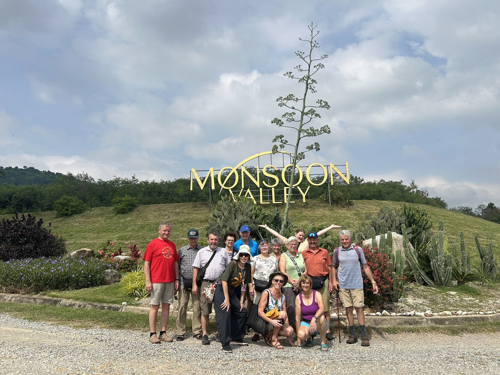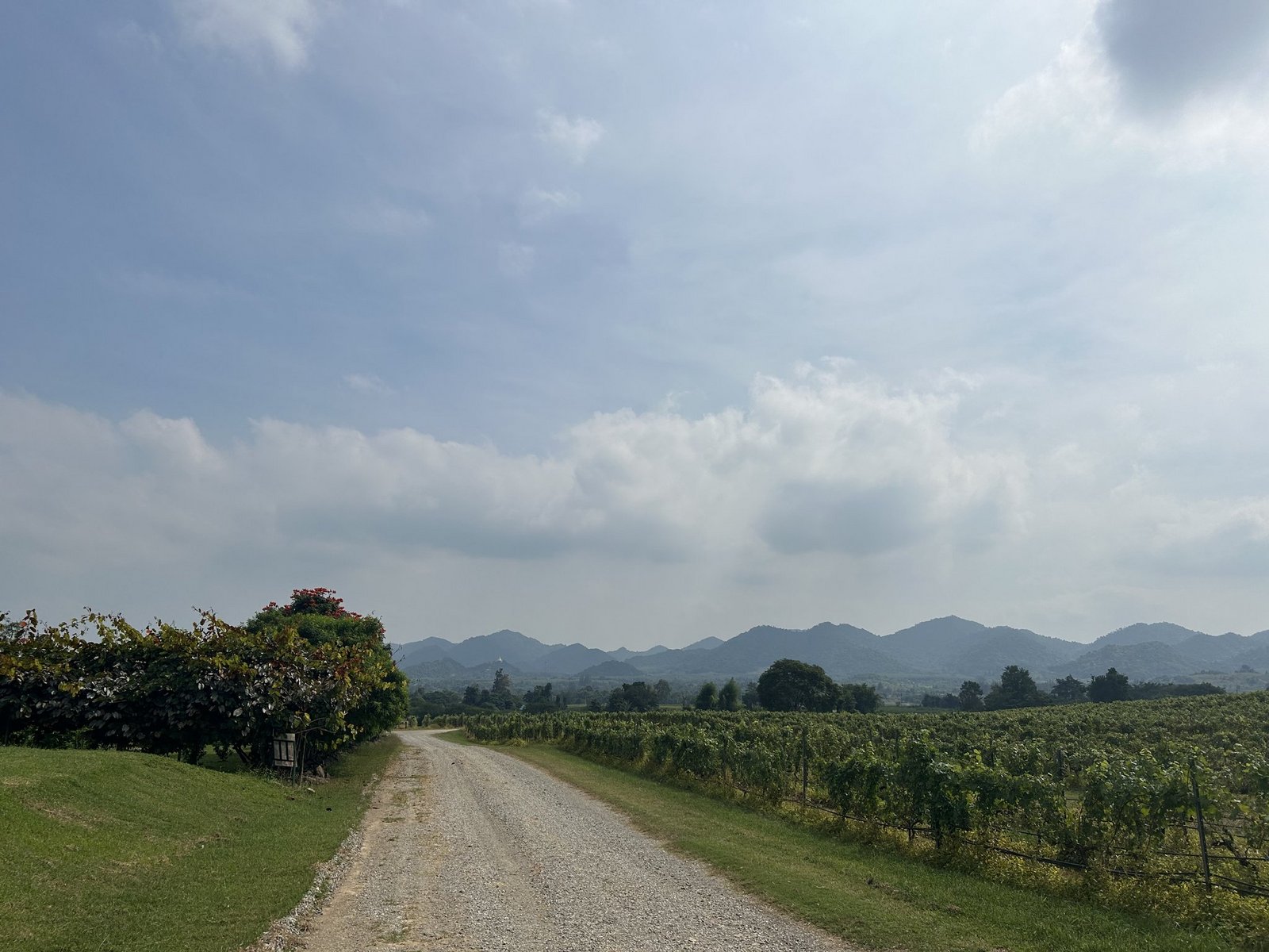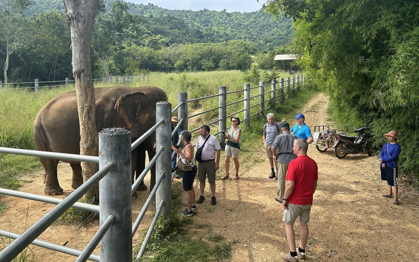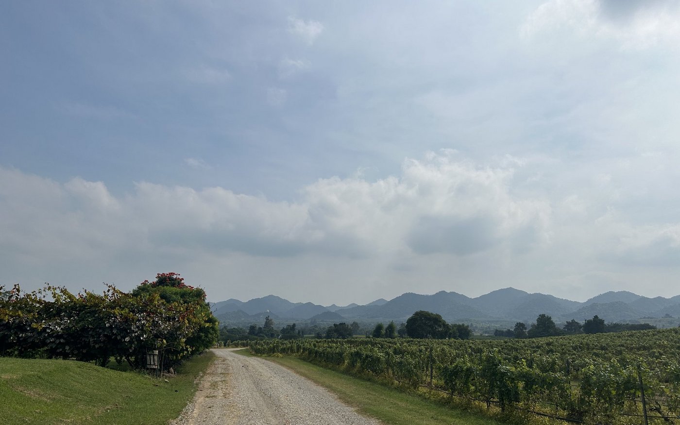 Auf unserem letzten Ausflug, nicht weit von Hua Hin, besuchen wir ein Weingebiet, das Elefantenfütterung als Attraktion für Touristen anbietet. Während der Führung, bei der wir mit einem Golfmobil durch das Gebiet fahren, bekommen wir die Gelegenheit, die Reben aus der Nähe anzuschauen. [IMG 21]