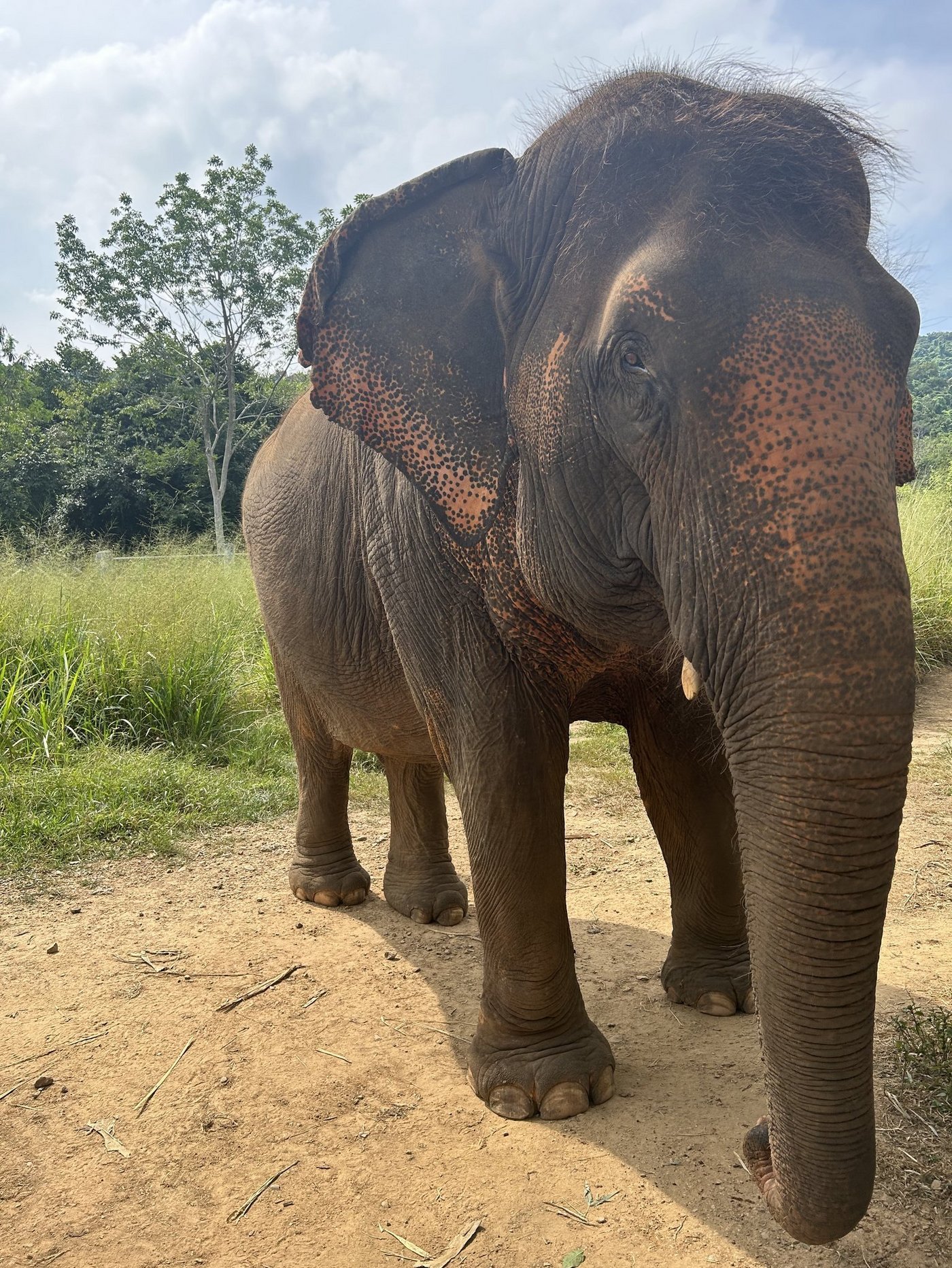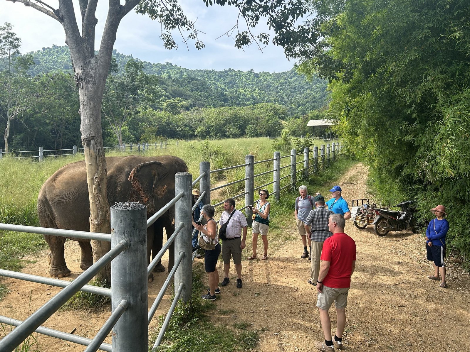 Nach dem Mittagessen und der Weindegustation führt uns ein schmaler Wanderweg zu einer Waldlichtung. Hinter dem meterhohen Zaun stehen die grauen Riesen und warten auf ihr Futter. Wir reichen ihnen Bananen und Gurken durch den Zaun hindurch und bekommen ein oder zwei Knutscher auf die Wange.