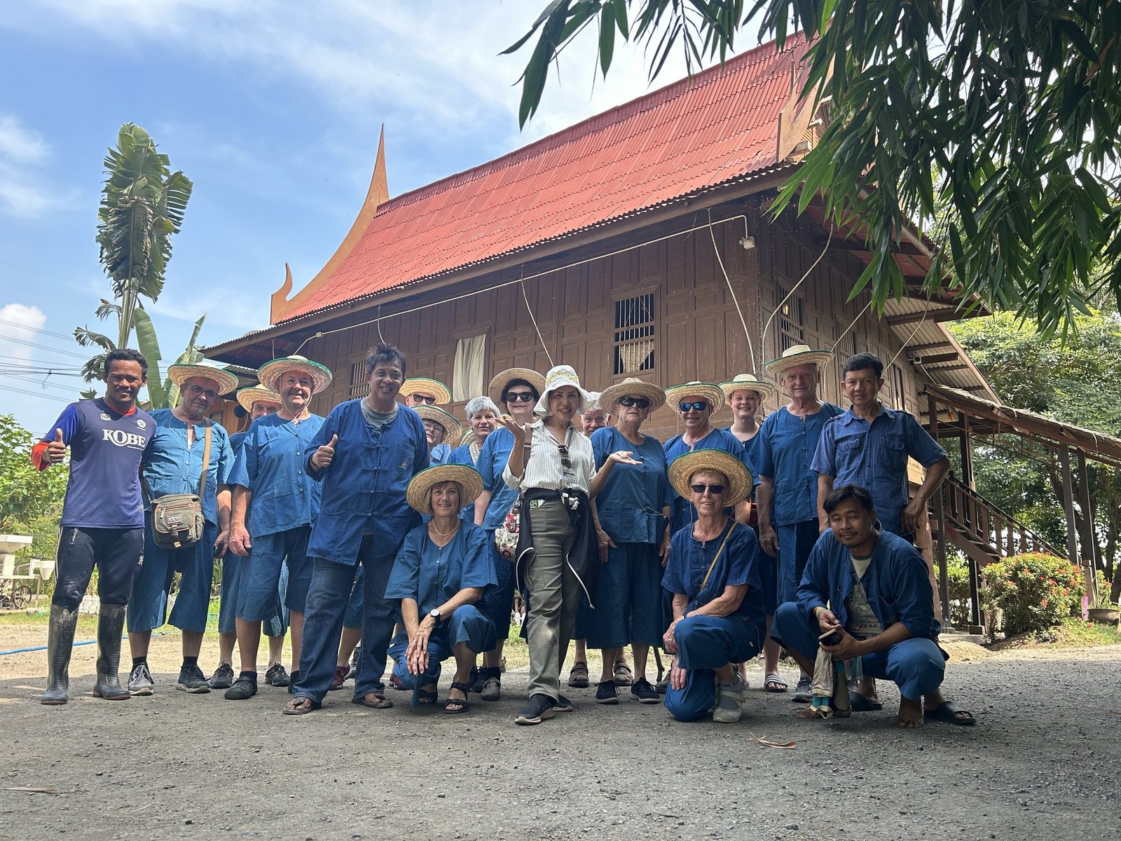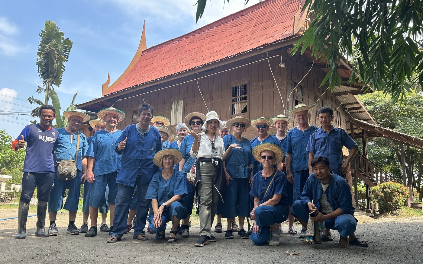 Nachdem wir richtig eingekleidet worden sind, dürfen wir beim Reispflanzen selbst Hand anlegen. Knietief und mit einem Reispflanzen-Büschchen ausgestattet, lernen wir, wie tief wir die einzelnen Pflanzen in den Schlamm zwischen unseren Füssen einsetzen müssen. Während der Busfahrt sehen wir viele Reisfelder, die einen überraschend hohen Wasserspiegel aufweisen. Da die Regenzeit während unseres Aufenthalts gerade erst vorbei war, erklärte der viele Regen das hohe Wasser. Die Regenzeit dauert in Thailand von April bis Ende Oktober. In der Winterzeit, die nach der Regenzeit kommt, herschen in Thailand immer noch 30° Celsius. In den Sommermonaten kann es bis zu 40–45° heiss werden. Unter 25° wird es in Thailand nur auf dem höchsten Berg, der auf 2'500 Metern über Meer liegt. Dort wird es im Winter bis zu 15° «kalt» und die Thais tragen Winterjacken und Mützen. Das setzt uns europäischen Gästen ein Lächeln aufs Gesicht.