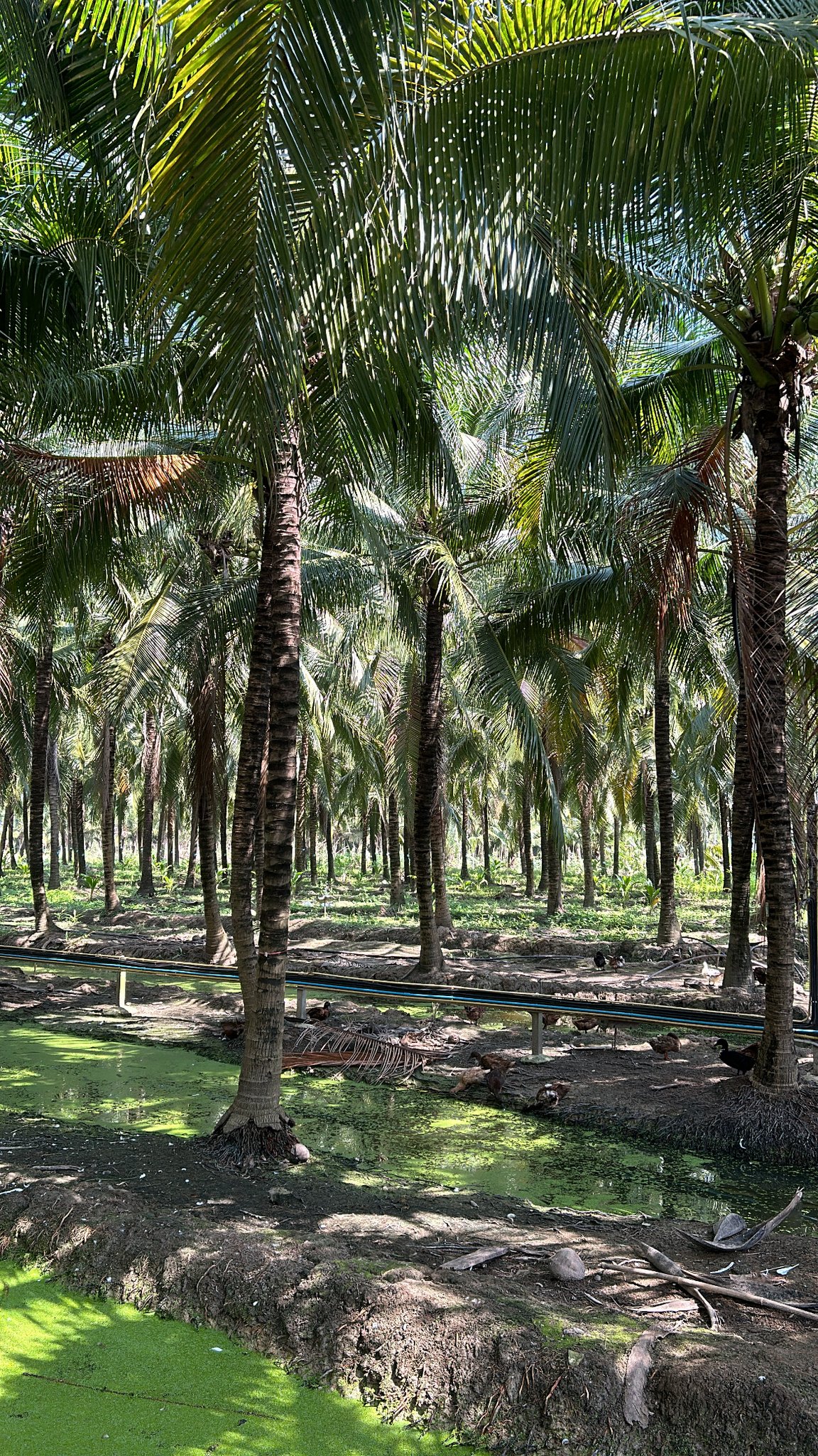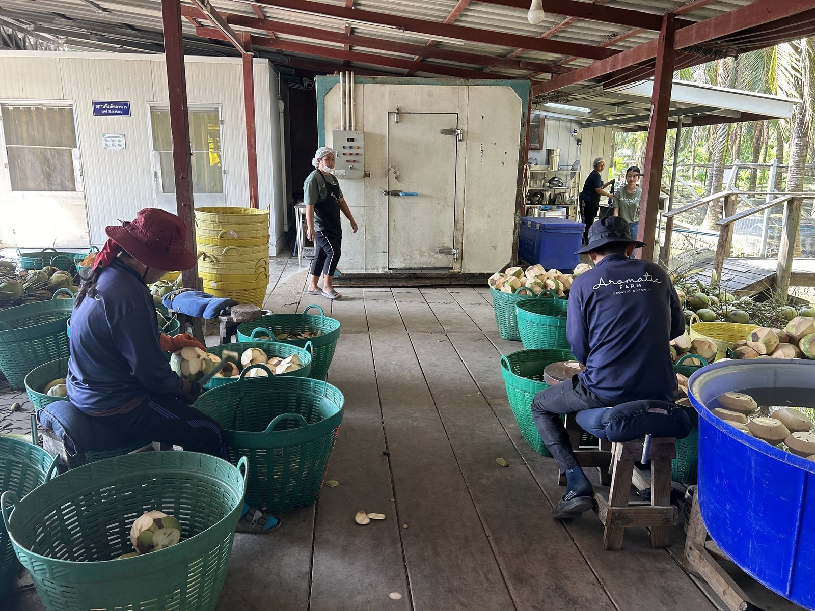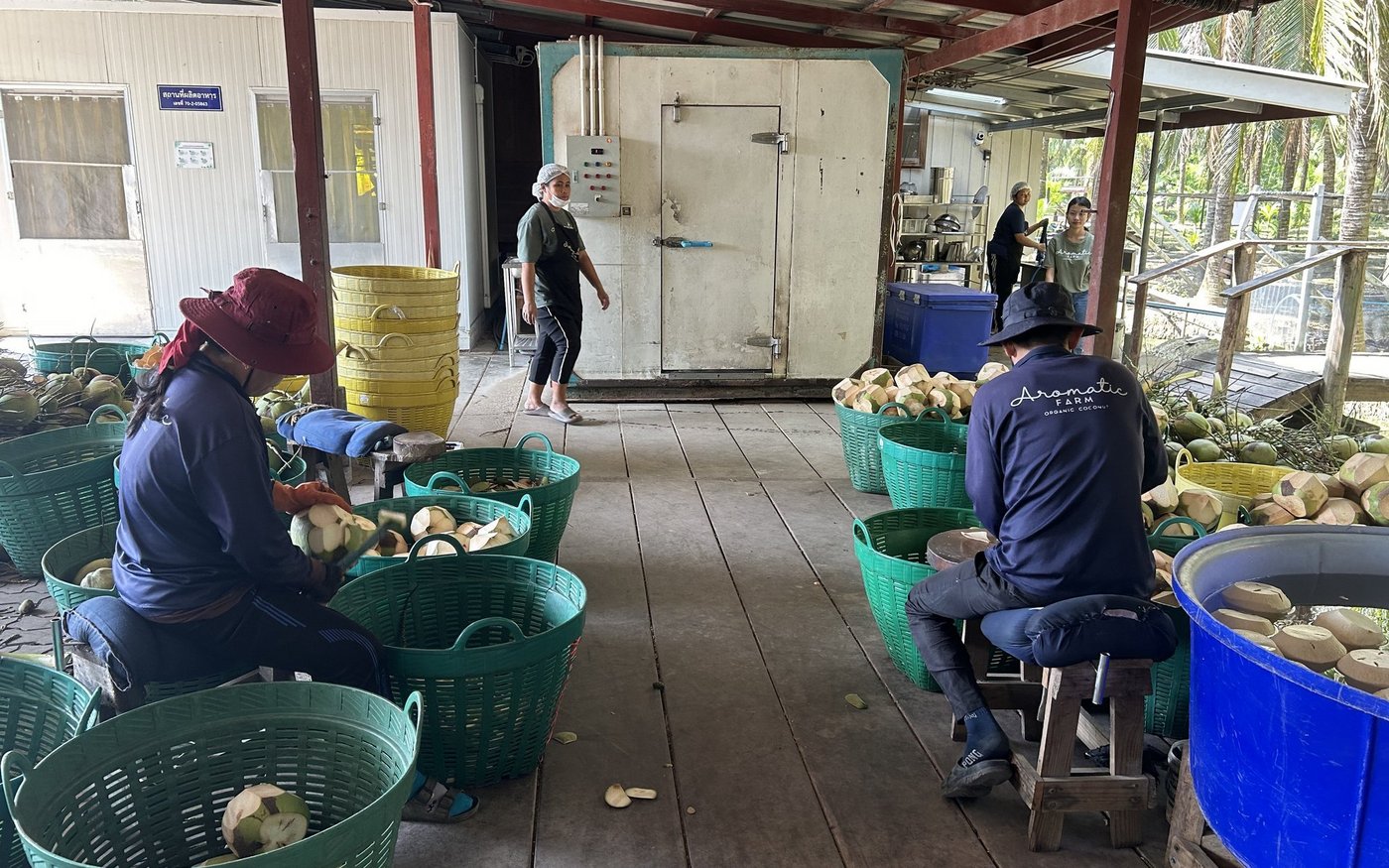 Etwa 100 Kilometer entfernt von Bangkok besuchen wir eine Kokosnussfarm. Durch die dichten Palmenblätter scheint die starke Mittagssonne. Vor der Besichtigungstour offeriert uns das Team Kokosnussmilch direkt aus einer frischen Frucht. Die Palmen stehen kilometerweit aneinandergereiht nebeneinander, zwischen jeder Reihe zieht sich ein Wassergraben durch das Gebiet.