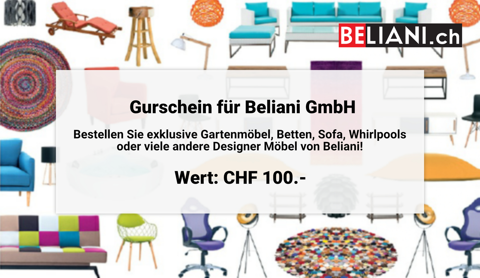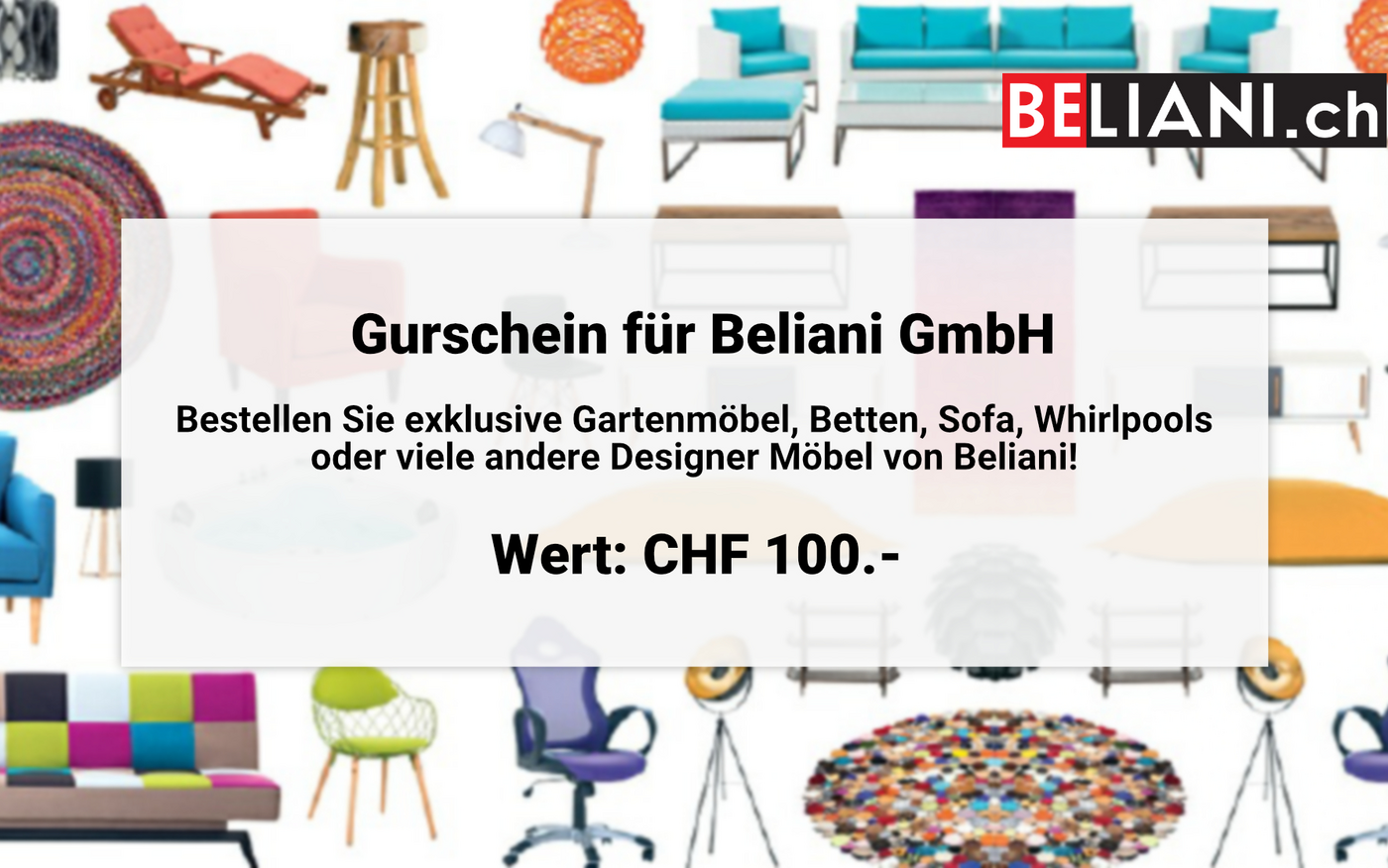 [IMG 12] Beliani ist der marktführende Online-Shop für Haus- und Gartenmöbel in der Schweiz. Bei Beliani finden Sie über 100.000 Produkte in verschiedenen Abteilungen, angefangen von Garten- und Wohnmöbeln bis hin zu Accessoires und Dekoartikeln. Wir verlosen zweimal einen Gutschein im Wert von je 100 Franken.