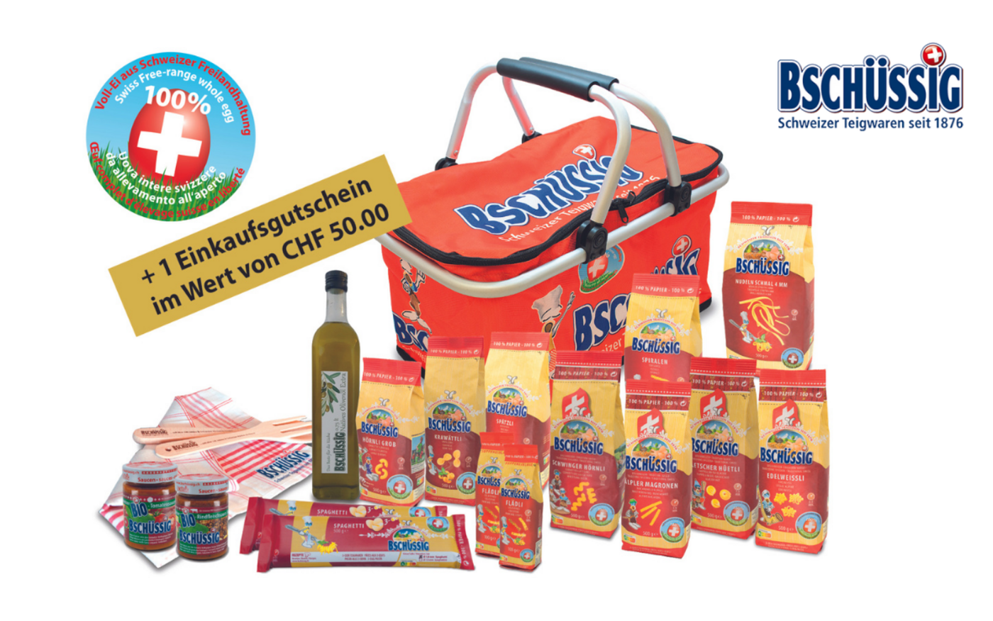 [IMG 2] Der praktische und zusammenfaltbare Einkaufskorb ist mit 5,7 kg feinsten Schweizer 3-Eier Teigwaren-Spezialitäten gefüllt. Dazu kommen 2 Schweizer Bschüssig Bio-Saucen mit je 330 g Inhalt und 1 Flasche Olivenöl Extra Vergine (0.75l), ein kariertes Bschüssig Küchentuch und ein zweiteiliges Holzbesteck. Zum Einkaufskorb erhalten Sie zusätzlich noch einen Einkaufsgutschein im Wert von 50 Franken für Ihre weiteren Teigwaren-Vorräte.