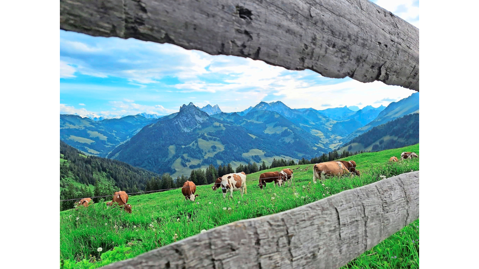 Mahlzeit mit Alpenpanorama: Die Kühe geniessen den schönen Alpsommerabend. (Bild: Christian Berger, Burgistein BE)