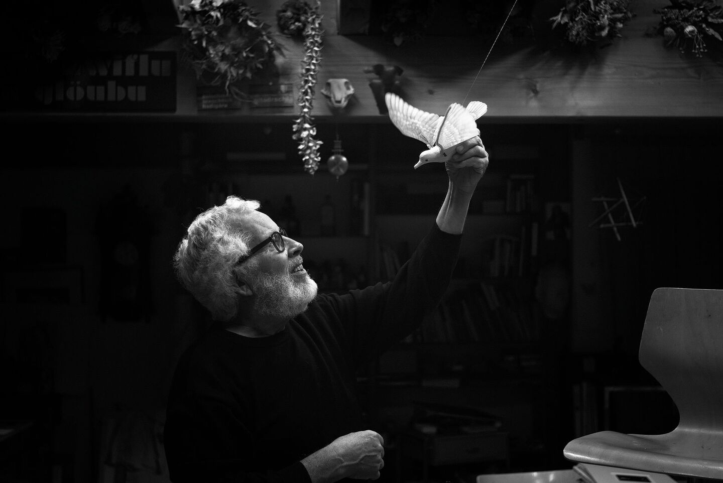 Ein Mann wie ein Gott. Ein weisser Vogel kreist um seinen Kopf, um diese prächtige Krone aus weissem Haar, die selbst zu leuchten scheint. Hier im Schatten, mit dem Licht, das durch die Tiefen des Ateliers sickert, das draussen im winterlichen Abgrund des Turtmanntals stirbt.