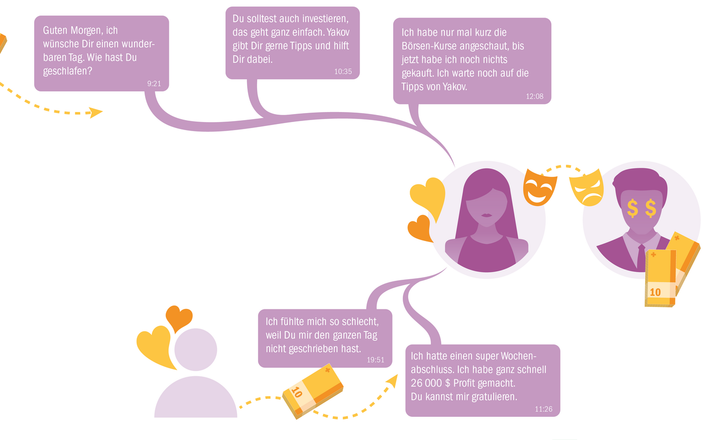 «Guten Morgen, Viktor. Ich wünsche Dir einen wunderbaren Tag», lese ich auf dem Display meines Handys. Die Nachricht ist von «Victoria». Der Lockvogel Victoria hat braune Haare und eine schlanke Statur. Sie ist 33 Jahre alt, hat ein eigenes Geschäft und wenn sie mal etwas Freizeit hat, ist sie gerne auf Reisen. Victoria ist aber noch etwas anderes – nämlich ein perfekter Lockvogel. Ihr Ziel? Das sind Männer wie ich…