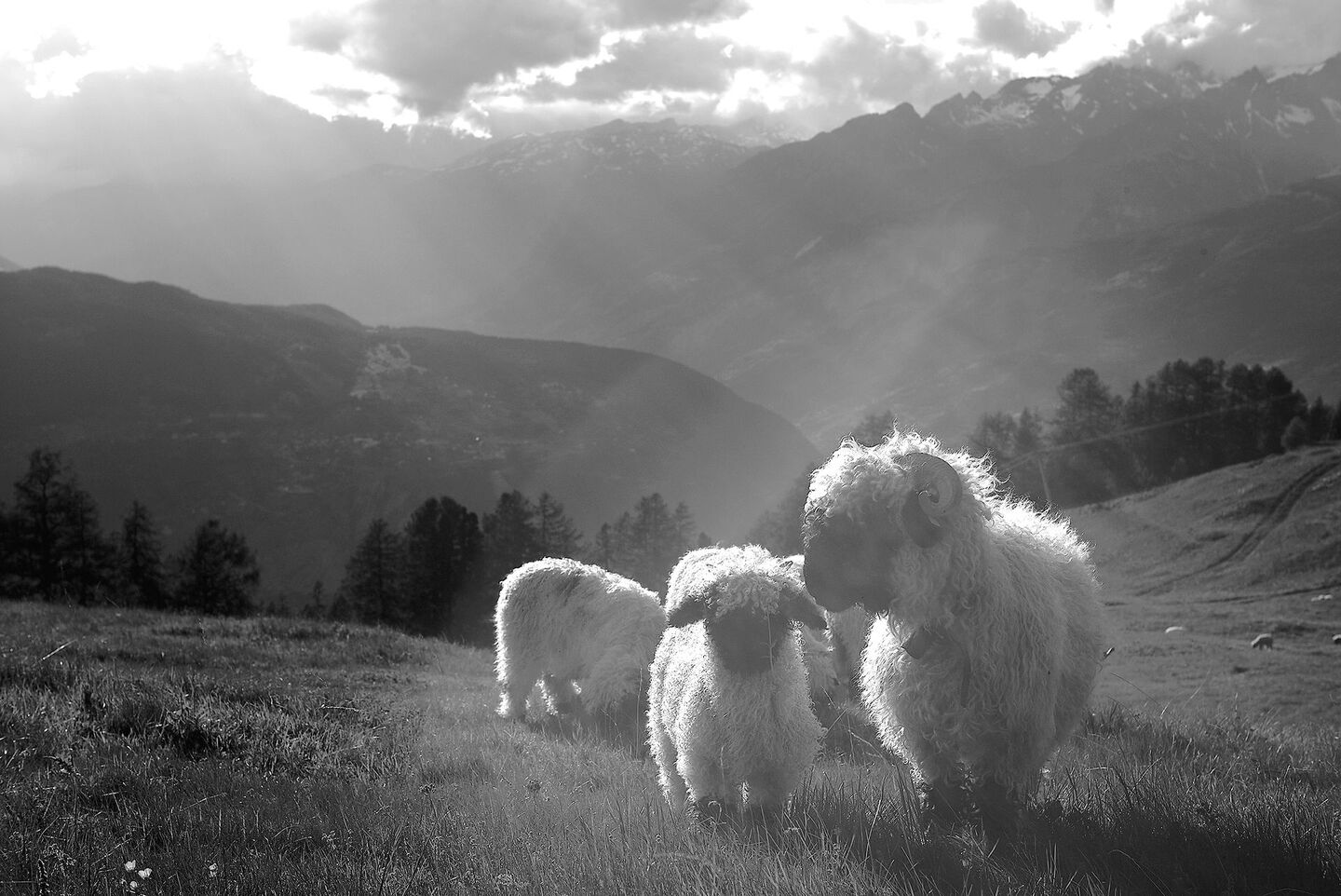 Das junge Schwarznasenschaf ist an mir genauso interessiert wie ich an ihm. Wir gehen mit kleinen Schritten aufeinander zu, über das weiche Gras, bis es von seiner Mutter gestoppt wird: eine schwarze Nase stösst sanft gegen die andere. Dies ist der erste Schritt auf seiner Reise, um diese niedrigere, mehr als 2000 Meter hohe Alp zu erreichen.