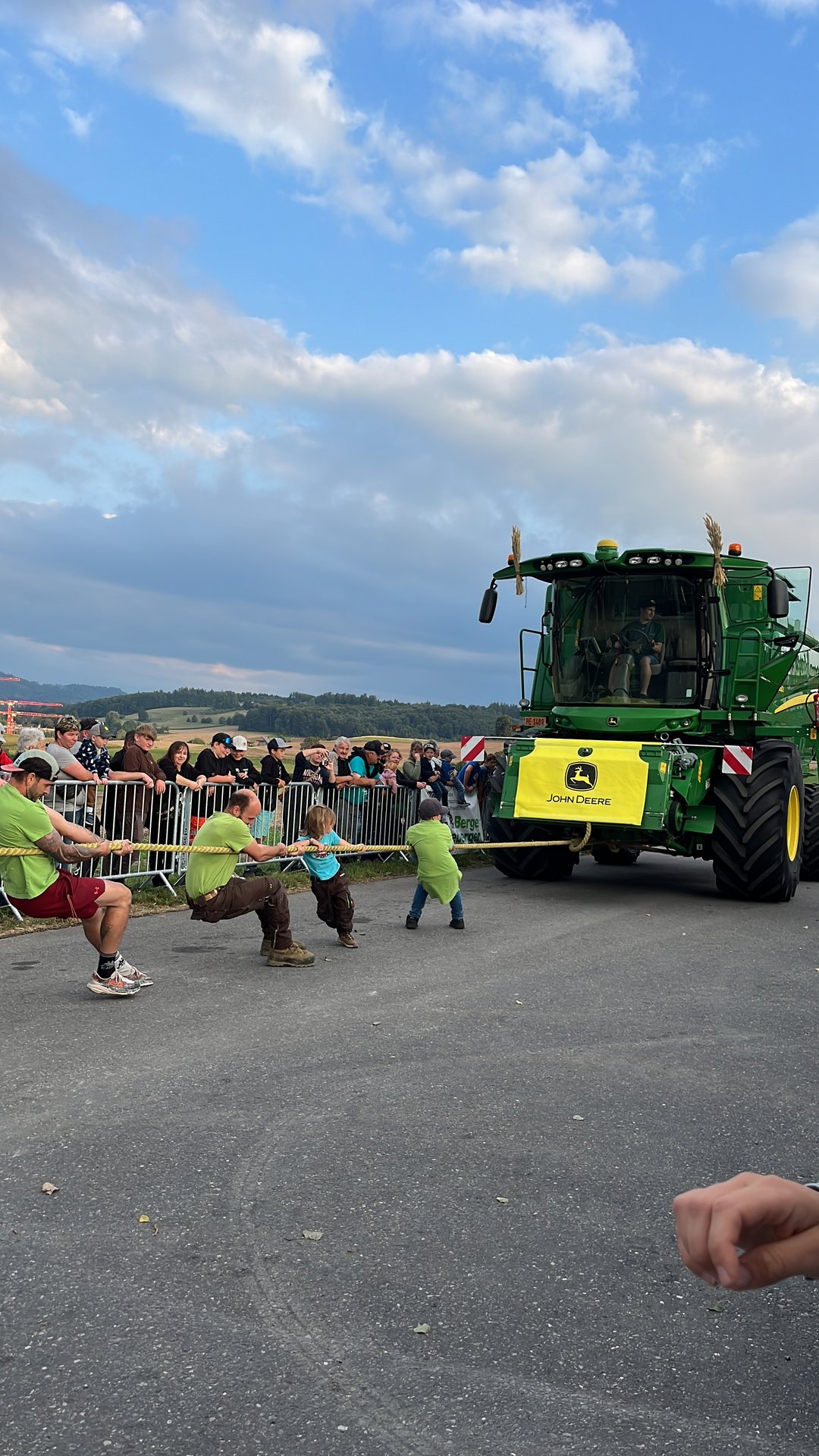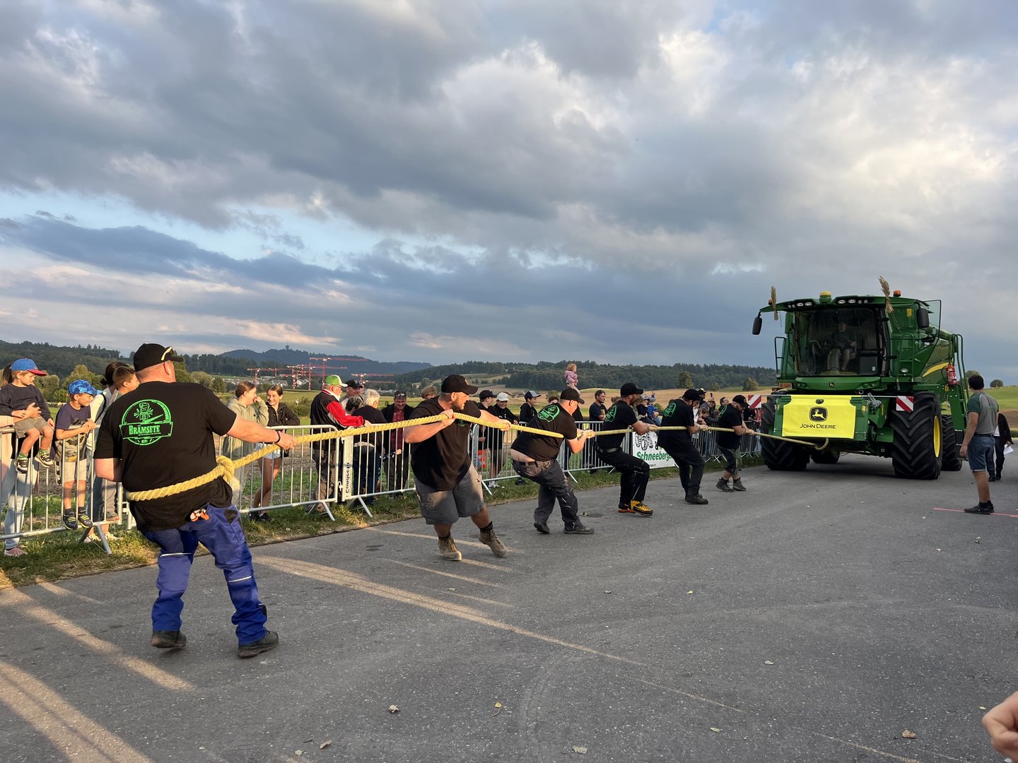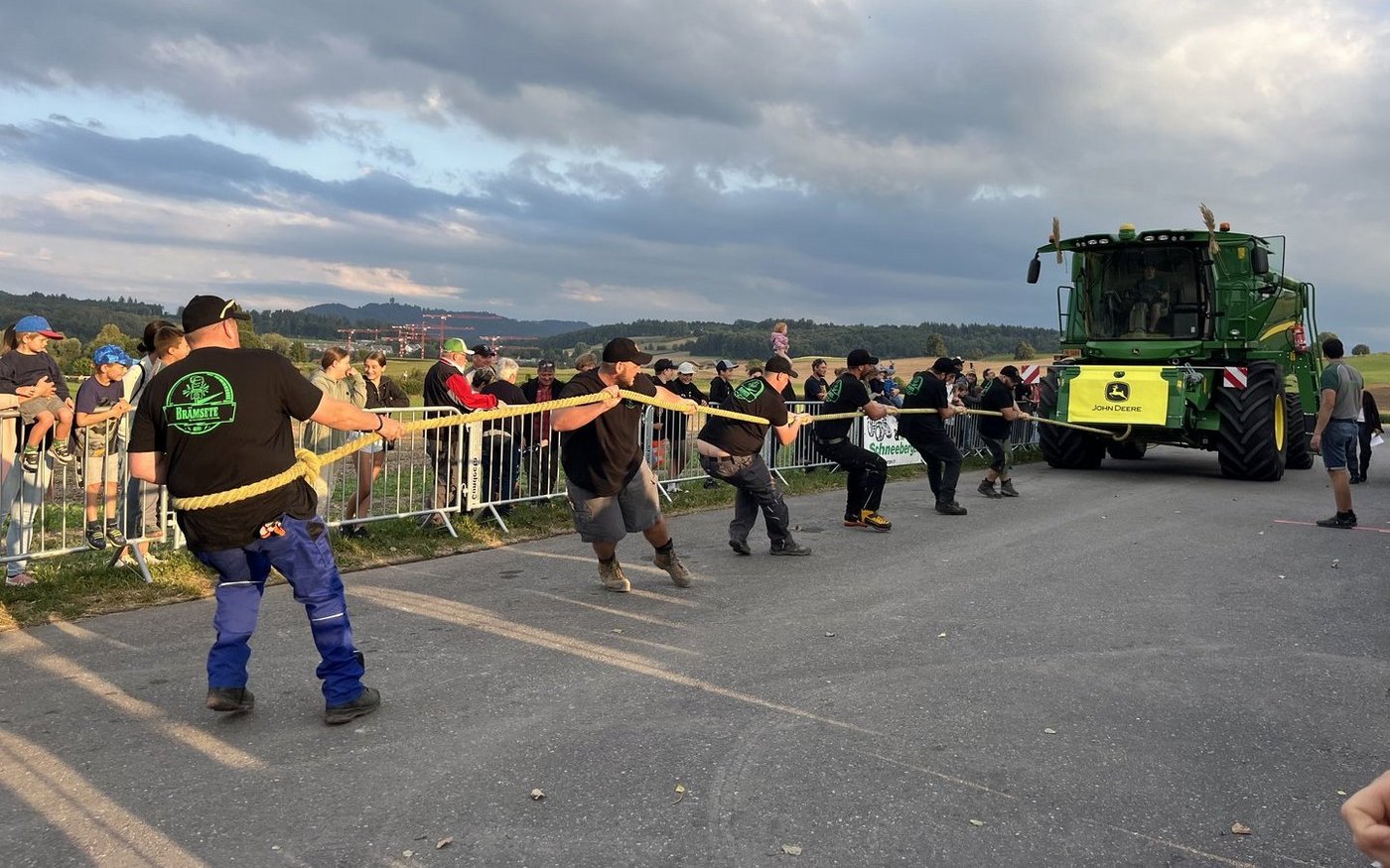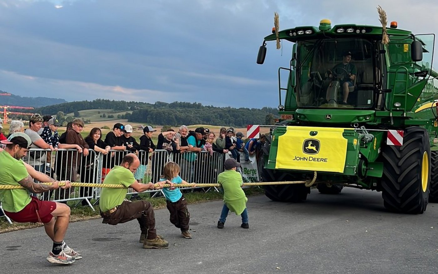 Bei der Challenge geht es beim ersten Durchlauf darum, den rund 16 Tonnen schweren Mähdrescher im neutralen Gang über eine Distanz von 30 Meter zu ziehen. Beim zweiten Durchlauf wird dem John Deere Mähdrescher zusätzlich der Mähbalken mit einem Gewicht von 2 bis 2,5 Tonnen angehängt. Das schnellste Team gewinnt. Ganz zum Schluss können dann noch die Kinder ran an das Seil. Für die Anmeldung können sich jeweils Teams bestehend aus sechs Personen oder bei reinen Frauenteams sieben Frauen einschreiben. Gewonnen hat das Sechser-Team «Les Welsch» aus der Romandie. «Wie letztes Jahr», wie eine Mitarbeiterin des Lohnunternehmers sagt.