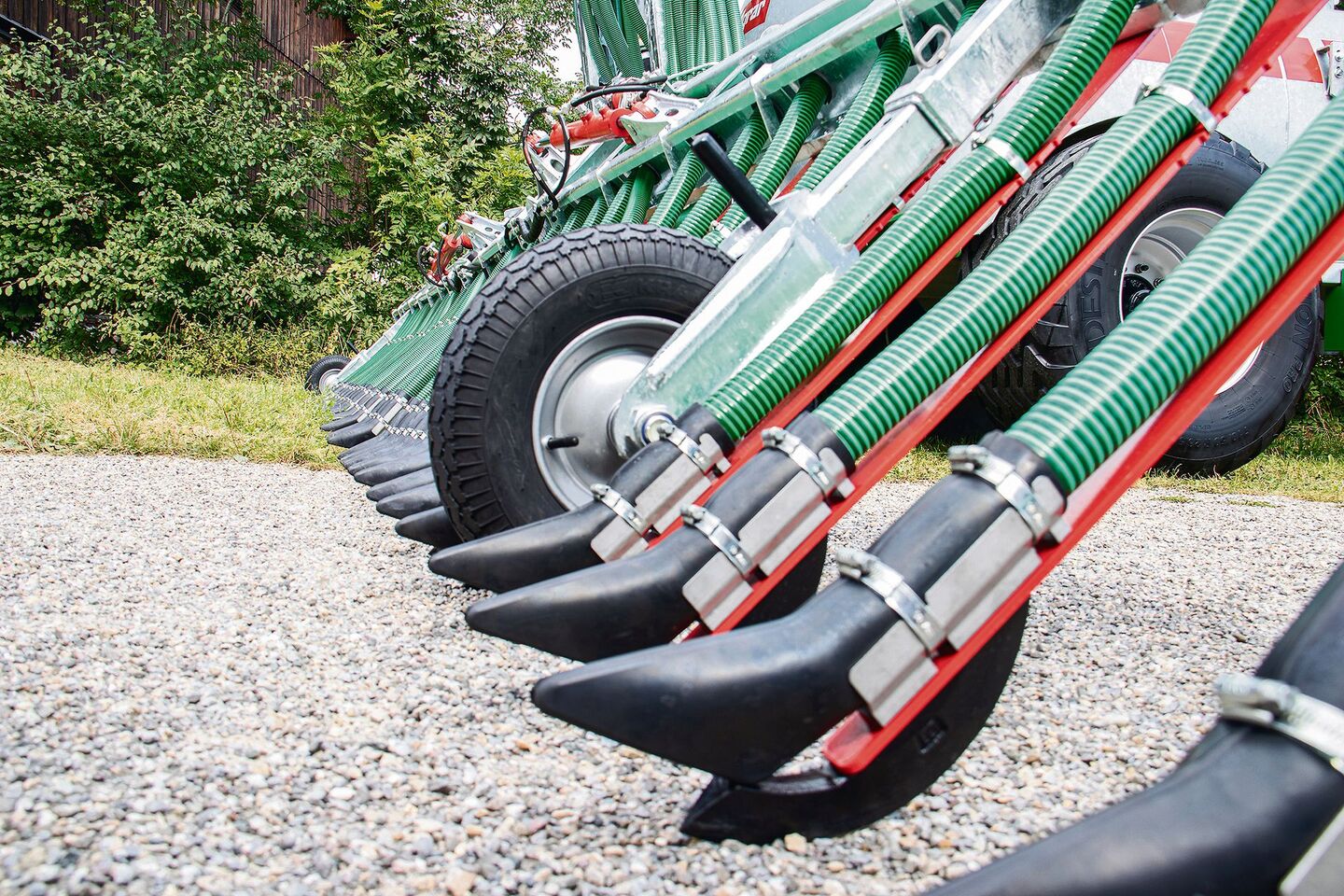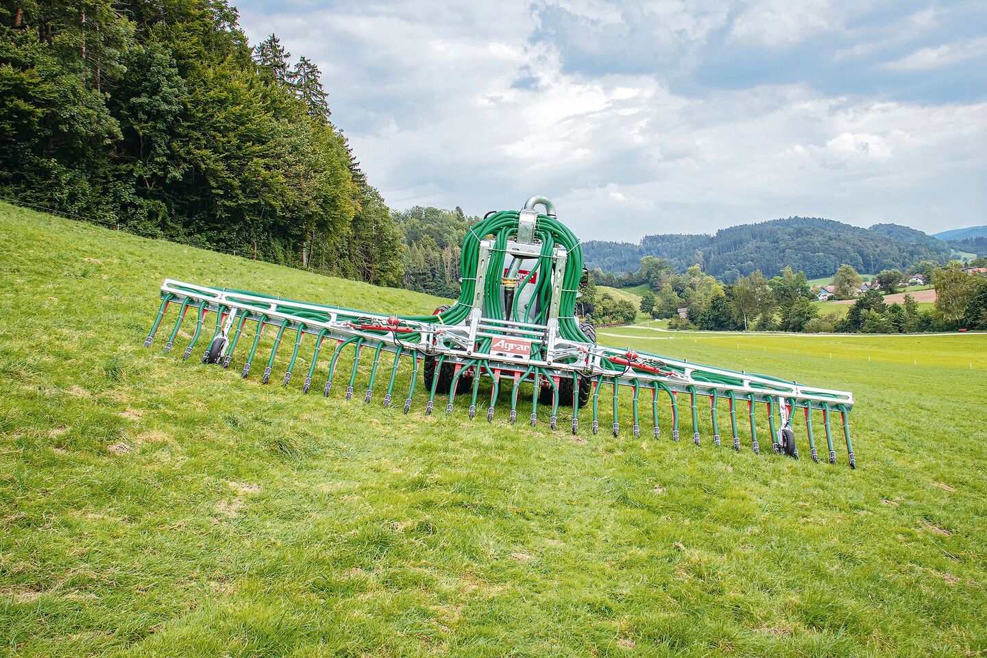 Auch die Schleppschuhe sind für einen Einsatz am Hang konstruiert: Sie bestehen aus Gussschlitzkufen mit Gummidüsen und werden von Federstahlplatten geführt. Durch den verstellbaren hydraulischen Gegendruck werden sie auch bei unebenem Gelände zuverlässig am Boden gehalten. Das Arbeiten am Hang wird zusätzlich dadurch unterstützt, dass sich die Arme des Verteilers individuell bewegen können, denn die Querverteilung findet seitenunabhängig statt. Gehalten werden die Arme durch serienmässig verbaute Stützräder.