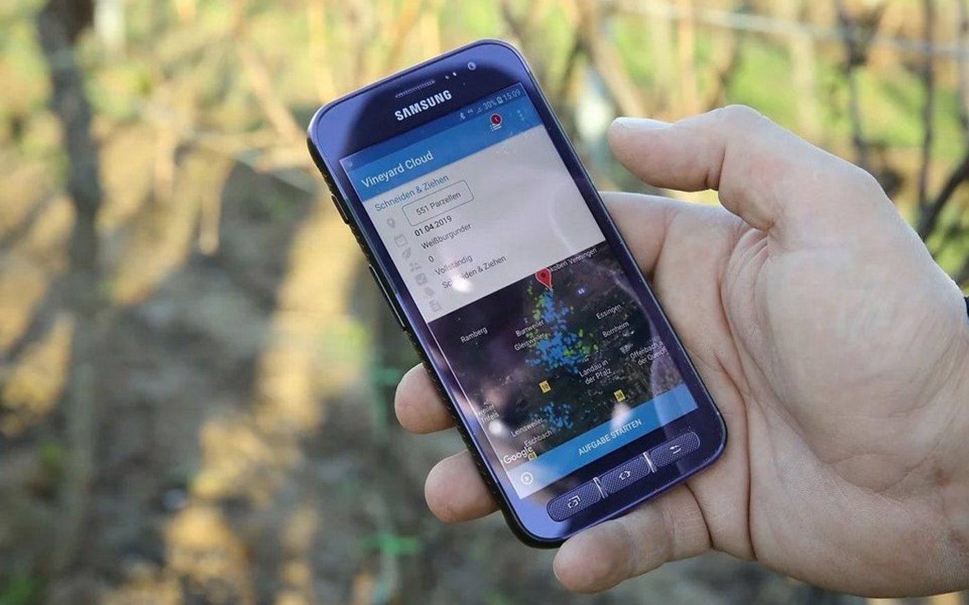 Vineyard Cloud wurde in der Pfalz, mitten im zweitgrössten Weinanbaugebiet Deutschlands, entwickelt. Die Software soll den Winzern helfen, alle Aufgaben zu planen, automatisch zu dokumentieren und später auszuwerten – und zwar von überall her, also auch von zu Hause, von unterwegs beziehungsweise im Weinberg. Das GIS-basierte Prozessmanagement ist insbesondere stark in den Bereichen Routenoptimierung, bei der Vernetzung mit intelligenten Spritzsystemen und bei der Düngeverordnung-Dokumentation.