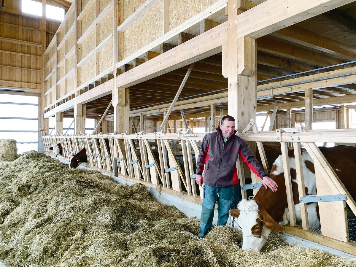 «Ich wollte keinen gewöhnlichen Bau», betont Willy Helfenstein. Das ist die neue Milchviehscheune beileibe nicht, die strotzt vor Holz. Wo immer möglich hat der handwerklich geschickte und sehr auf Nachhaltigkeit bedachte Landwirt versucht, auf diesen einheimischen Rohstoff zu setzen. So sind sogar die Trennbügel in den Liegeboxen und die Zugänge zum Melkstand aus regionalem Holz. Und auch das zentral auslösbare…