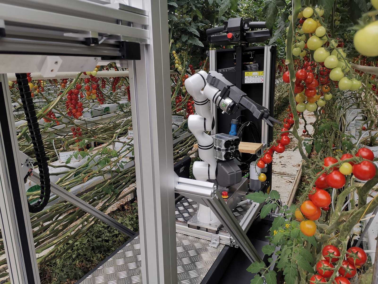 Im letzten Jahr liess der Maschineningenieur einen ersten Prototypen mit einem Roboterarm in zwei Gewächshäusern nach Cherry-Tomaten greifen. Der Roboter bestand primär aus Kameras zur Erkennung der Tomatenrispen, der Software und einem Roboterarm. Technisch funktionierten das Ernten und Entlauben bereits ziemlich gut, doch es fehlte noch an der Präzision und an Geschwindigkeit.