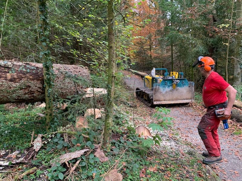 Im Erholungswald bei Meggen LU kommt lediglich die Kettensäge und aufgrund der schmalen Pfade ein zugemieteter selbstfahrender Raupenschlepper mit Seilwinde zum Einsatz. Das 2,5 t schwere Gefährt mit 6 t Zugkraft zieht ferngesteuert die gefällten dürren Käferholz-Stämme bis zum mit dem Forwarder befahrbaren Weg.