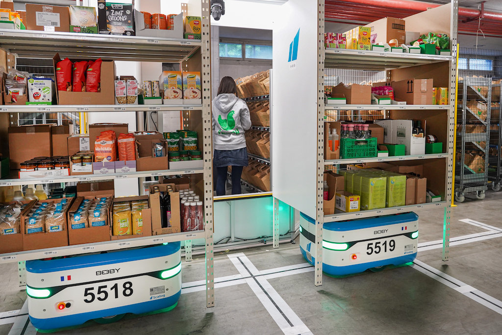 Normalerweise müssen die Mitarbeitenden auf der Suche nach dem gewünschten Produkt für den bestellten Warenkorb durch die Regalreihen gehen. Im Zentrallager des Online-Hofladens Farmy hingegen ist eine Roboterflotte von Scrallog im Einsatz, wie es in einer Mitteilung heisst. Diese bringen die Regale zu den Mitarbeitenden.