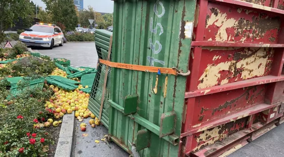 Verletzt wurde niemand. Die Äpfel mussten von Hand aufgelesen und der umgekippte Anhänger durch ein privates Abschleppunternehmen geborgen werden.