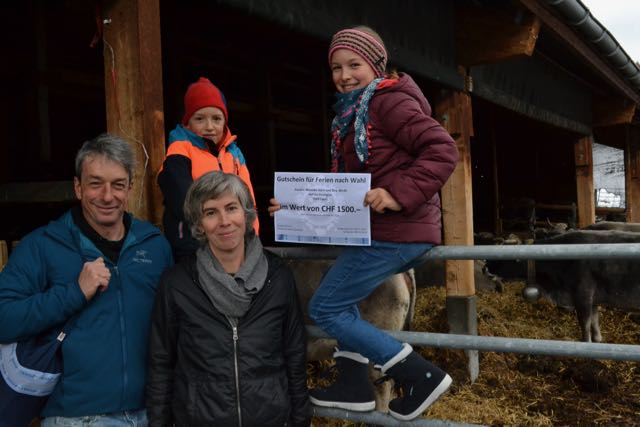 Dieses Jahr hat diesen Gutschein die Familie Wirth Kern aus Lavin GR gewonnen. Die Kinder Meret und Serafin freuen sich zusammen mit den Eltern Rebekka Kern und Jürg Wirth auf die bevorstehenden Ferien. Die Eltern sehen sich schon in einem Häuschen im Tessin oder in einem tollen Hotel im Südtirol. Sohn Serafin will unbedingt ins Legoland.