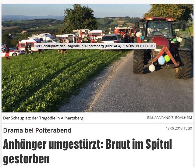 15 Frauen nahmen bei einem Junggesellinnenabschied am 8. September in Allhartsberg (Österreich) auf einem Anhänger Platz. Am Steuer des Traktors sass der Bruder der Braut. Die fröhliche Ausfahrt mit dem geschmückten Anhänger endete tragisch: Plötzlich geriet das Gefährt ins Schwanken und kippte in einer Rechtskurve um. 13 der Fahrgäste wurden aus dem Anhänger geschleudert.