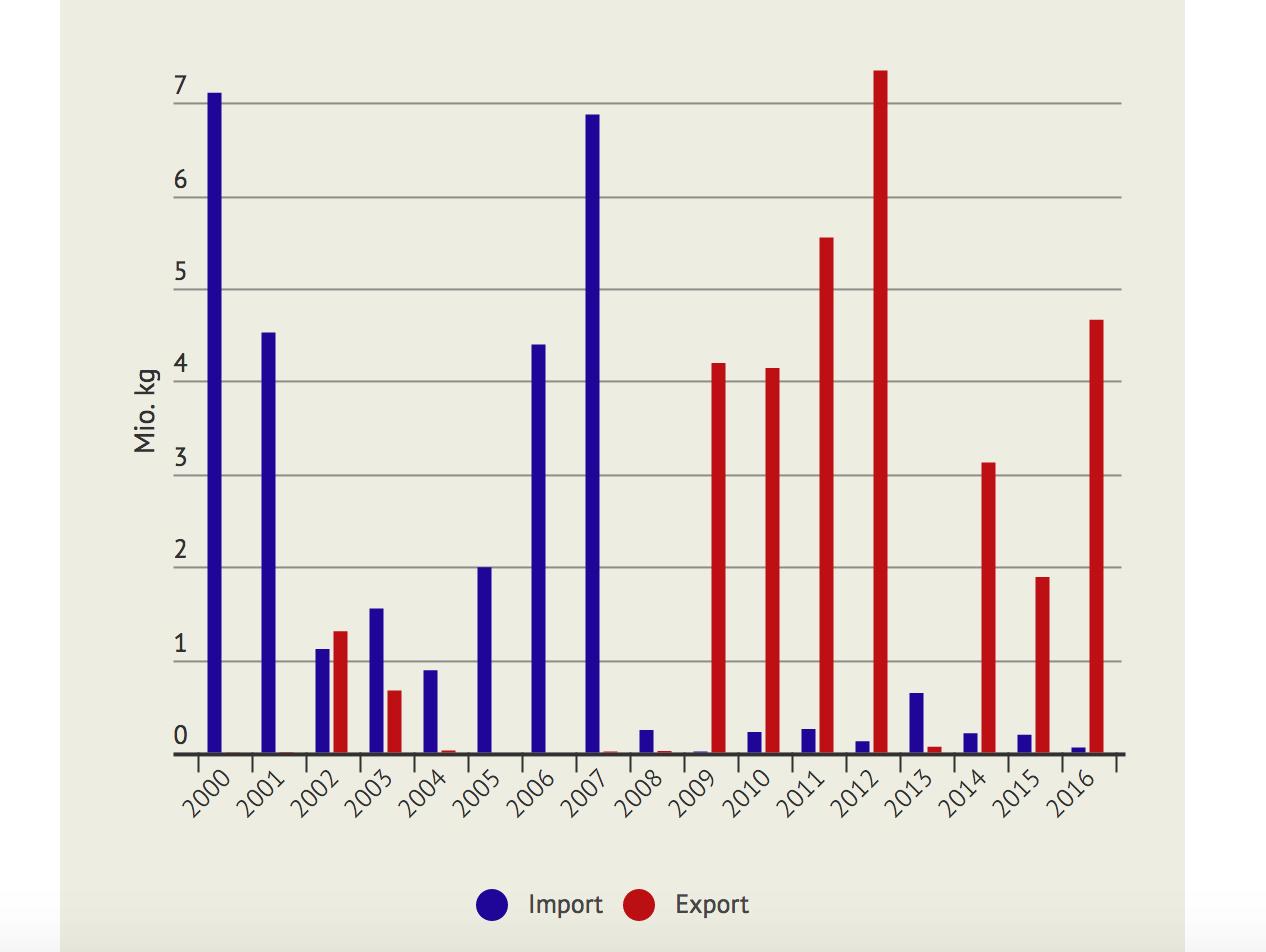 Bis vor zehn Jahren wurden jährlich bis zu 7'000 Tonnen Butter importiert. Mit der Aufhebung der Milchkontingentierung hat sich die Schweiz jedoch von einer Netto-Importeurin zu einer Netto-Exporteurin gewandelt.