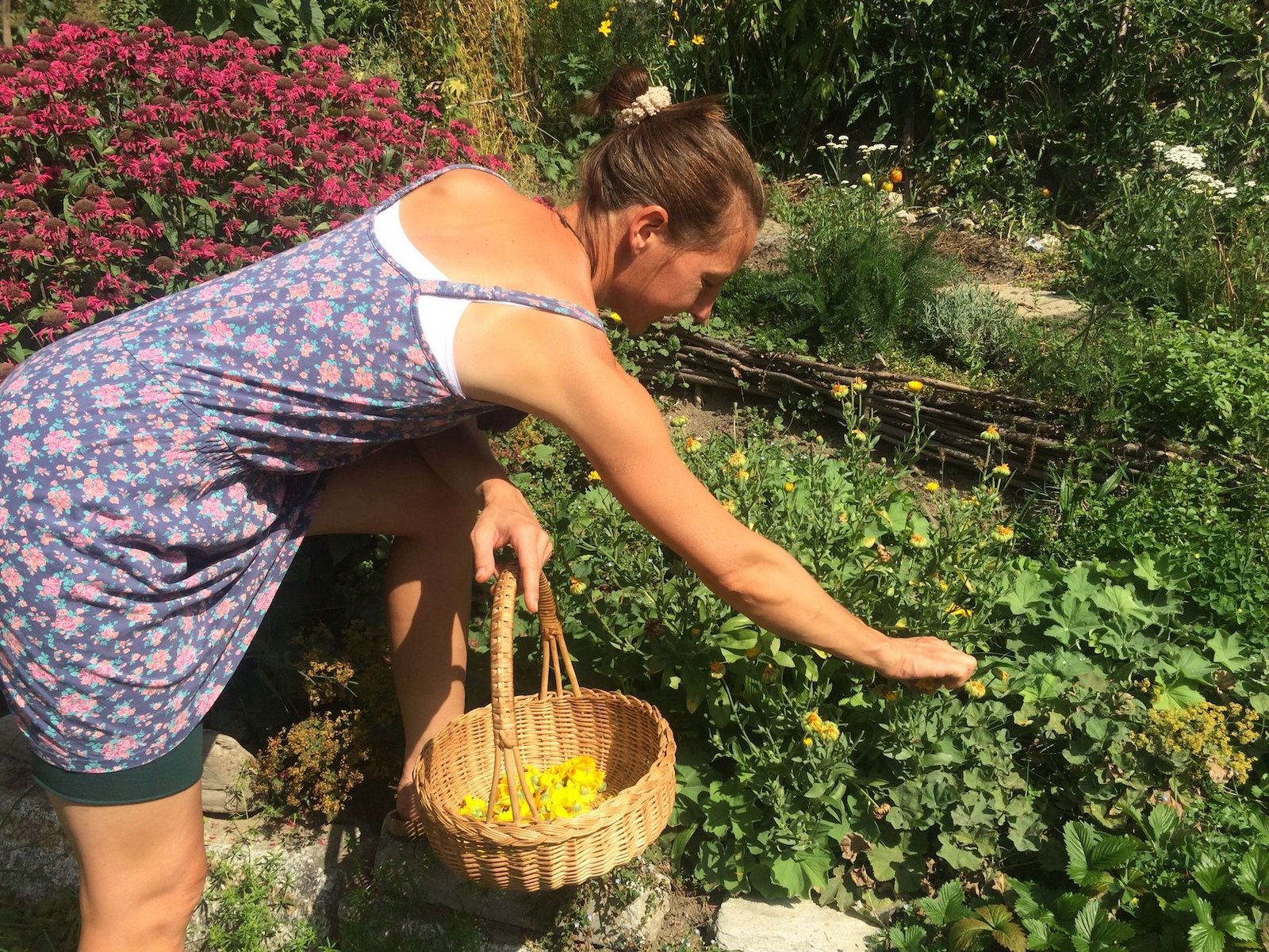 Die Verarbeitung von Kräutern und Wildblumen zu Salben und Tinkturen gelingt vor allem dann, wenn man sie mit der nötigen Ruhe und Aufmerksamkeit herstellt. «Bist du schlecht gelaunt, dann wird das nichts», weiss Simone Heit. Die eigene Kraft gehe immer auch mit hinein. Die 37-jährige Deutsche füllt heute Tinkturen ab, die sie am Zentralschweizer Biomarkt in Zug am Wochenende vom 1. und 2. September verkaufen will. Dafür werden frische Ringelblumen-Salben hergestellt. «Zu diesen Tätigkeiten kann ich gut reden», sagt sie. Die Herstellung von Beinwellsalbe beispielsweise brauche mehr Konzentration. Seit drei Jahren arbeitet Heit im Organisationskomitee des Zentralschweizer Biomarktes «O Sole Bio» mit. Fürs Ressort Brauchtum und Unterhaltung ist sie dieses Jahr zuständig. Die Arbeiten sind bereits alle erledigt.